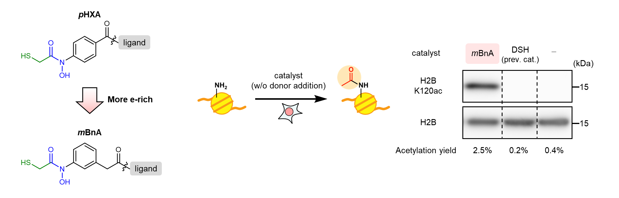 Based on our findings, we synthesized a mBnA catalyst with a more electron-rich HXA. As expected, the histone acetylation activity was significantly improved. As a next step, we attempted to catalyze histone acetylation in living cells. In initial trials, reactions with a high concentration of an exogenous acetyl donor were performed. We also tried the reactions without external donors as negative control experiments. Interestingly, the mBnA catalyst promoted histone acetylation using only endogenous Ac-CoA without adding exogenous acetyl donor, the phenomenon which had never been observed with the previously developed catalysts. This was the most exciting moment in this research. It was delightful that the incorporation of the hydroxamic-acid catalytic core has yielded such a remarkable "0 to 1" achievement.