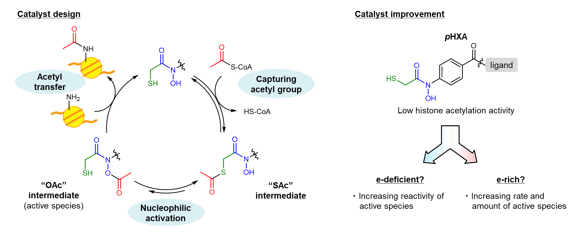 To efficiently and potently activate the acetyl group of Ac-CoA, we devised a design that combines a thiol group as an Ac-capturing motif with a hydroxamic acid moiety (HXA) as a catalytic core for nucleophilic activation5. Contrary to our expectations, however, the histone acetylation activity of the initially synthesized catalyst, pHXA, was low in a test tube. Improving the catalyst activity was essential, but formulating a strategy for structural modifications was not a straightforward task; if HXA is more electron-deficient, the reactivity of the active "OAc" intermediate is likely to increase, and if it is more electron-rich, the rate and amount of "OAc" formation is expected to increase. It was difficult to predict whether e-deficient or e-rich would be more effective. Still, we finally found that the reactivity of the "OAc" intermediate is sufficient and that increasing its production is the key to improving activity. We reported on this catalyst improvement process in more detail in a preprint version of this paper6.