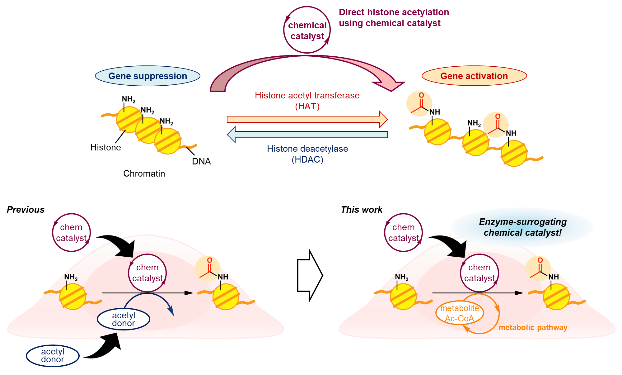 We have developed a lysine acylation catalyst, mBnA, which serves as a surrogate for endogenous histone acetyltransferases by promoting acyl group transfer from cellular Ac-CoA to histone protein lysine residues. This would be a steppingstone to a new therapeutic strategy replacing dysfunctional endogenous enzymes with chemical catalysts to regulate disordered epigenetic histone acetylation in disease. Toward this future vision, research is currently underway to intervene in transcription and phenotype through the catalyst-mediated histone acetylation, or acylation in more general. In addition, the detection of compartmentalized Ac-CoA concentration using the mBnA catalyst may contribute to future biochemical studies on Ac-CoA metabolism.