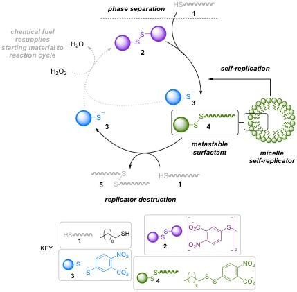 In this system, a surfactant molecule 4 is constructed in a biphasic reaction between components 1 and 2. Above the critical micelle concentration this surfactant self-assembles into micelles, which catalyse the biphasic reaction required to form new surfactant 4. We therefore call them self-replicating.
