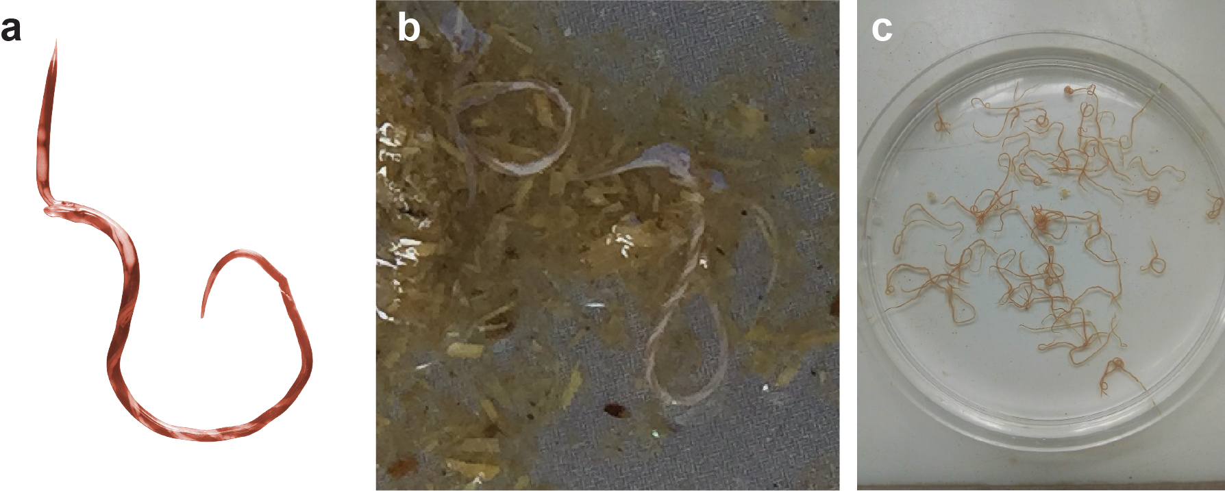 Figure 1. a. A single adult female H. contortus, showing its distinctive “barber’s pole” gut (courtesy of John Gilleard, University of Calgary, Canada). b. Two H. contortus worms, freshly isolated within gut contents (courtesy of Stuart Ralph, University of Melbourne, Australia). c. Many H. contortus worms, cleaned and ready to be used in the lab (courtesy of Essia Sebai, University of Tunis El Manar, Tunisia).