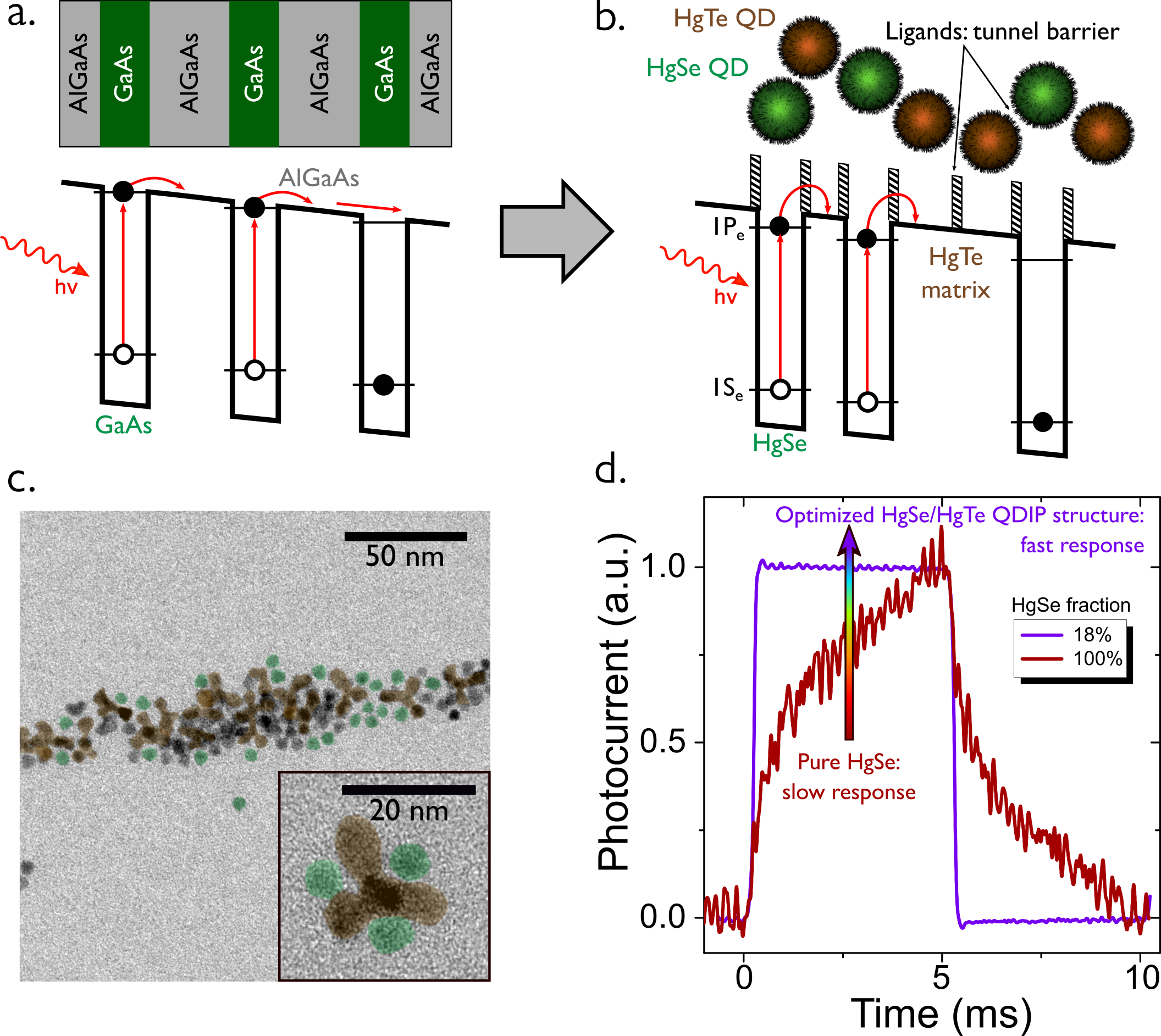 Under illumination, light is absorbed in HgSe thanks to the intraband transition, and the electron gets transferred to the HgTe NC array, which conduct the charge up to the electrodes. Using this metamaterial, a fast time response was obtained, see Figure 1d.