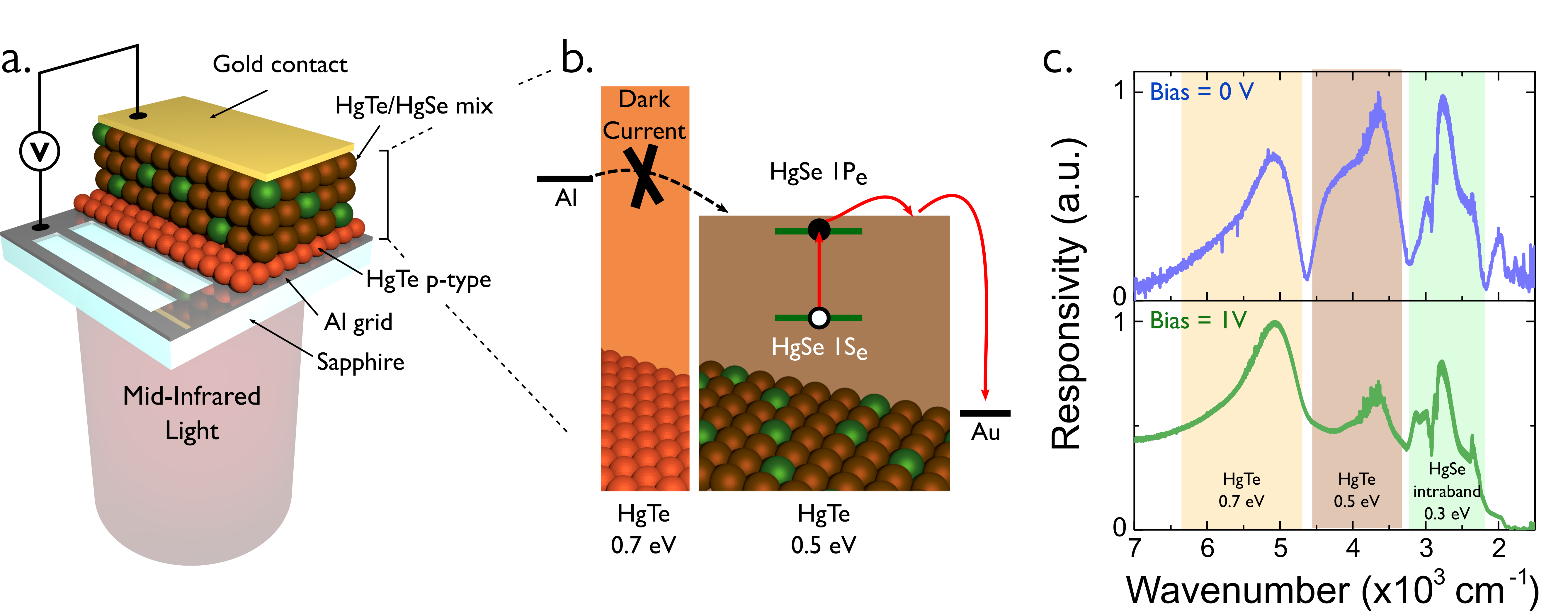Figure 2 Design of an intraband photodiode from a CQDIP. a. Scheme of the device. Illumination is provided from the back-side through a sapphire substrate and a patterned aluminum electrode allowing 70% of light transmission in the MWIR. b. Band alignment diagram of the diode structure. HgTe with a wide bandgap (0.7 eV, in orange) is used as a unipolar barrier to filter injection of dark current into the active HgSe/HgTe layer. c. Photocurrent spectra measured at 80 K under 0 V and 1 V bias, showing photoresponse coming from the HgSe intraband absorption (green), HgTe transport matrix (brown) and HgTe barrier (orange).