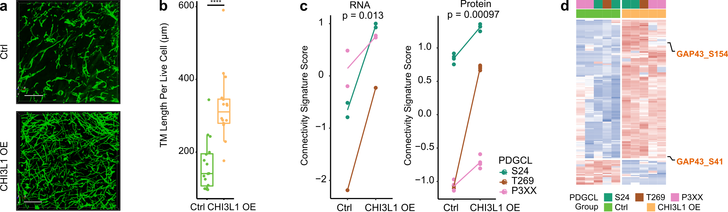 To investigate if CHI3L1 is not only a marker but also a driver of TM-connectivity, we applied a CHI3L1 blocking antibody to PDGCLs, which resulted in reduced TM lengths. Additionally, overexpressing CHI3L1 in PDGCLs led to longer TMs and increased the number of TM connections (Figure 3a-b). Diving into the mechanism of CHI3L1-driven TM-connectivity, the molecular profiles of CHI3L1 overexpression cells were assessed by RNA-Seq, proteomics, and phosphoproteomics. The results showed that overexpression of CHI3L1 led to an increased AC signature score, decreased NPC1 signature score, and a higher connectivity signature score at both RNA and protein levels (Figure 3c). Interestingly, overexpression of CHI3L1 also led to higher phosphorylation in a previously identified TM driver, GAP43 (Figure 3d). These findings support the role of CHI3L1 as a connectivity driver.