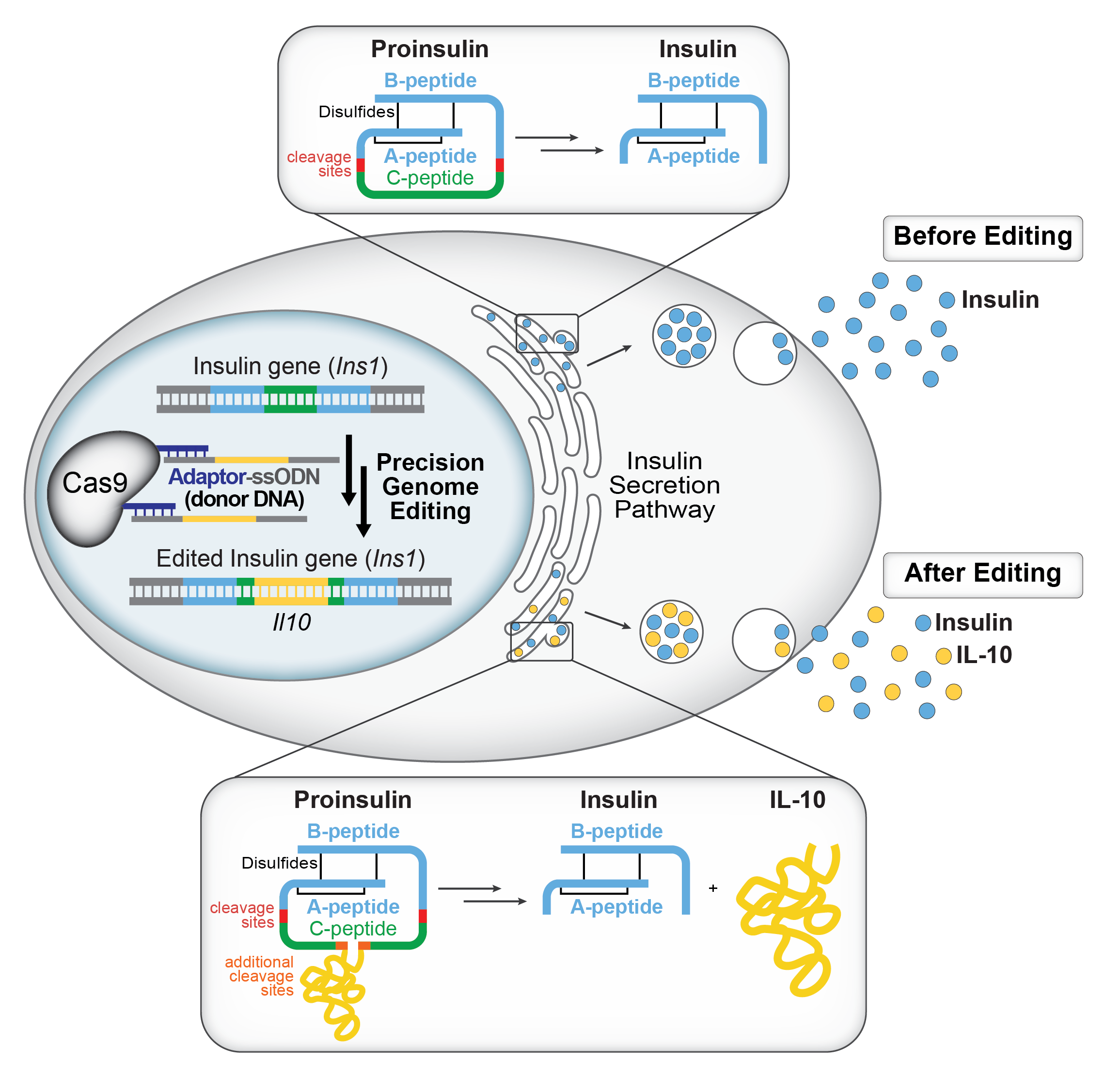 Figure 1. Our developed technology allows for Cas9 to display various cargoes. The mono- or multivalent adaptor sequence allows for ssODNs containing a small (17 nt) complementary DNA sequence to be tethered to Cas9 to enhance HDR in a variety of cell types. We can knock in Il10into the insulin gene (Ins1) at the C-peptide so that when insulin is processed, insulin and anti-inflammatory IL-10 are secreted together. Top box:When endogenous insulin is processed, the C-peptide is cleaved and insulin is secreted. Bottom box:When our edited insulin is processed, the C-peptide is cleaved and both insulin and IL-10 are secreted. We envision that these designer beta cells will propel cell replacement therapeutics for Type 1 diabetes, and that the gene editing technology will be applied to other system to enhance HDR.