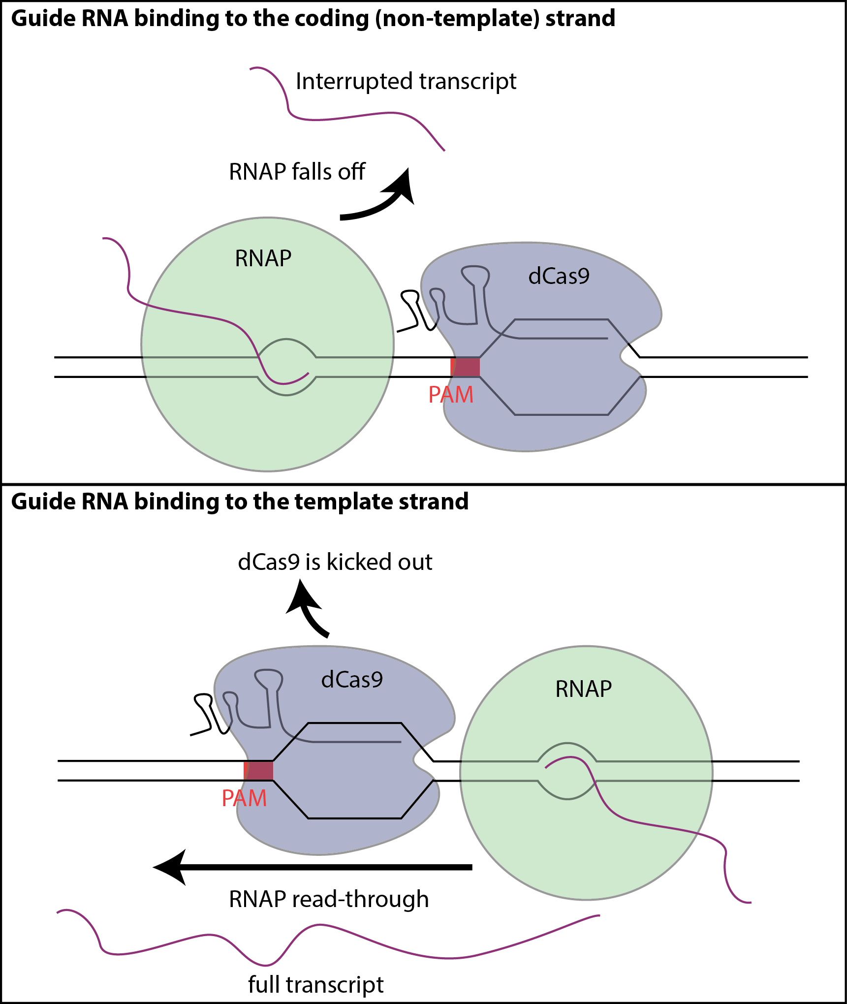 During my postdoc in the laboratory of Luciano Marraffini at the Rockefeller University I had the chance to work on the early developments of CRISPR-Cas9 technologies and in particular their application to modify the genome of bacteria or control gene expression. The catalytically dead variant of Cas9 known as dCas9 can be programmed to bind almost any gene of interest, but it just sits on the DNA instead of introducing a break as Cas9 would. Binding of dCas9 to DNA is strong enough to block the RNA polymerase when in the proper orientation (the guide must bind to the coding strand of the target gene), and the ease with which it can be reprogrammed makes it a fantastic tool to study the effect of silencing genes.