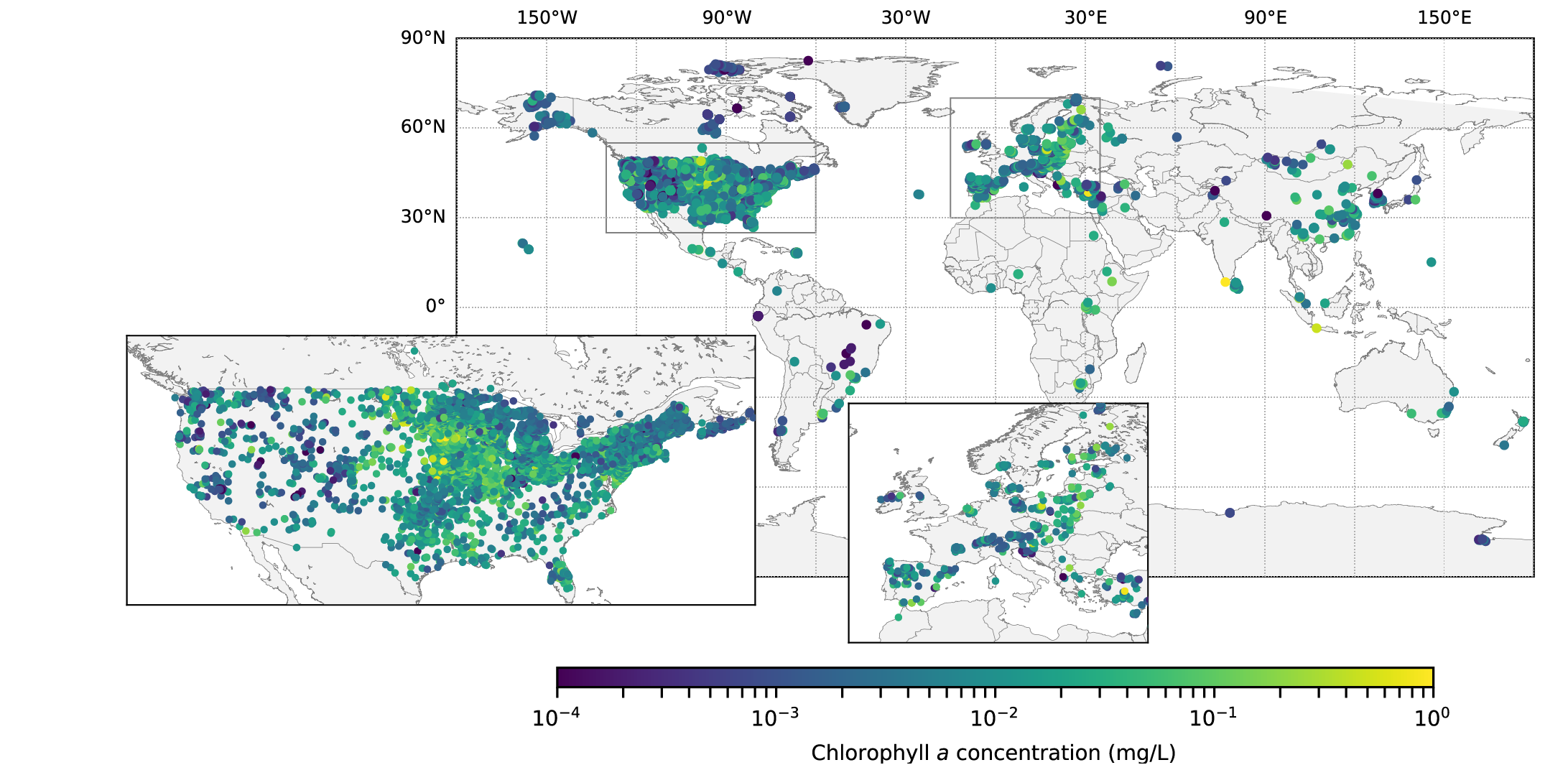 Most of the lakes in the database are found in the United States and Europe, but we did have coverage on all continents including Antarctica. Lake records of chlorophyll went as far back as 1933, although most observations were more recent (>2000). Almost half of all observations included data about phosphorus, a significant driver of chlorophyll concentrations and an indication of nutrient inputs within the watershed. All observations also included geospatial coordinates that allow for integration with remote sensed or reanalysis data, including climate and land cover. This database has been invaluable for us to discern the role of nutrient inputs, land use changes, and climate on primary production in lakes.