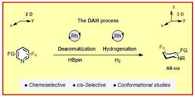 However, one important piece of the puzzle was missing! The formation of fluorinated piperidines was not possible at that point. We tried to tackle this problem by looking for different reaction conditions, including alternative catalysts. Unfortunately, we were unable to reduce pyridine precursors owing to, we believe, catalyst poisoning by the substrate or the product. In some cases, we observed trace reactivity, but hydrodefluorinated products were the main outcome. We therefore tried to develop an efficient process that could enable fluoropyridine hydrogenation by overcoming catalyst poisoning and loss of the fluorine atoms. Keeping this in mind, we thought that adding an initial step that could first break the aromaticity of the substrates, forming a mixture of diene intermediates, would facilitate the hydrogenation reaction.