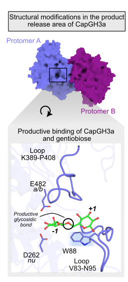 The endo-β-glucanase (CapGH16_3) and β-glucosidase (CapGH3b) from the herbivore gut Bacteroidota exhibit structural and functional similarities to the enzymes in B. ovatus PUL, dictating similar roles on linear mixed-linkage β-glucans degradation. However, another β-glucosidase, CapGH3a, diverges significantly, with its structure adapted for recognizing β(1,6)-glycosyl units. This unique capability arises from the presence of only one aromatic platform in the product release area, a tryptophan residue that provides a necessary degree of freedom for the binding and stabilization of β(1,6)-glucosyl units (Figure 2). The aforementioned tryptophan belongs to a conserved loop observed only in β(1,6)-glycosidases of the GH3 family.