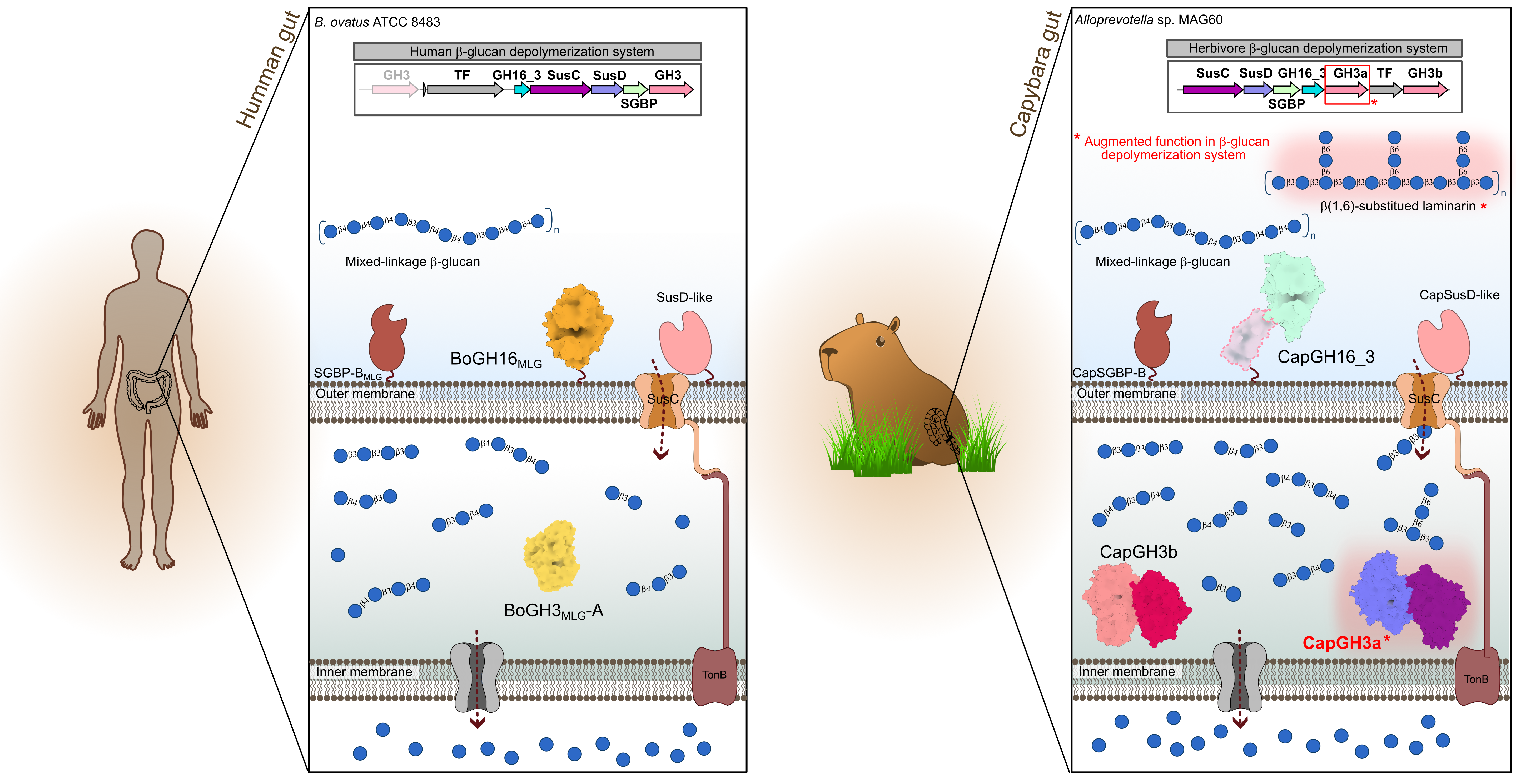 The work performed by Mandelli, Martins, Chinaglia et al. identified and characterized a PUL from Alloprevotella sp. MAG60, a novel bacterium from Bacteroidota phylum found in the capybara gut. This PUL shares genetic similarities with Bacteroides ovatus PUL from the human gut, including essential enzymes, like endo-β-glucanase from the GH16_3 family and β-glucosidases from the GH3 family, which degrade linear mixed-linkage β-glucans. However, the PUL from the herbivore gut exhibits expanded functionality, enabling it to also degrade substituted β-glucans containing β(1,6) linkages, a capability that relies on the activity of the CapGH3a enzyme, a β-glucosidase active on β(1,6) linkages (Figure 1). This evolutionary adaptation enables herbivores to process a broader spectrum of plant polysaccharides, highlighting the microbiota adaptation to tackle the dietary demands of these animals.