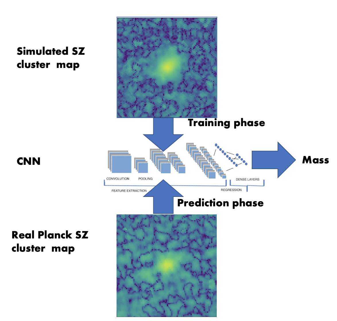 To address this issue, we generate almost 200 thousand SZ maps from The300 simulations (http://the300-project.org/) that are statistically similar to the real Planck clusters in mass, redshift, signal intensity and noise levels. We further train a set of Convolutional Neural Networks (CNN) using the mock images aiming at predicting the masses of over one thousand SZ cluster maps provided by the Planck collaboration. Note that the CNN model does not rely upon assumptions on the ICM physics, but it receives input data directly from simulations. We show that the CNN predicted masses are in agreement with Planck masses but with a slight bias which might be caused by SZ intensity and mass scaling relation parameters.