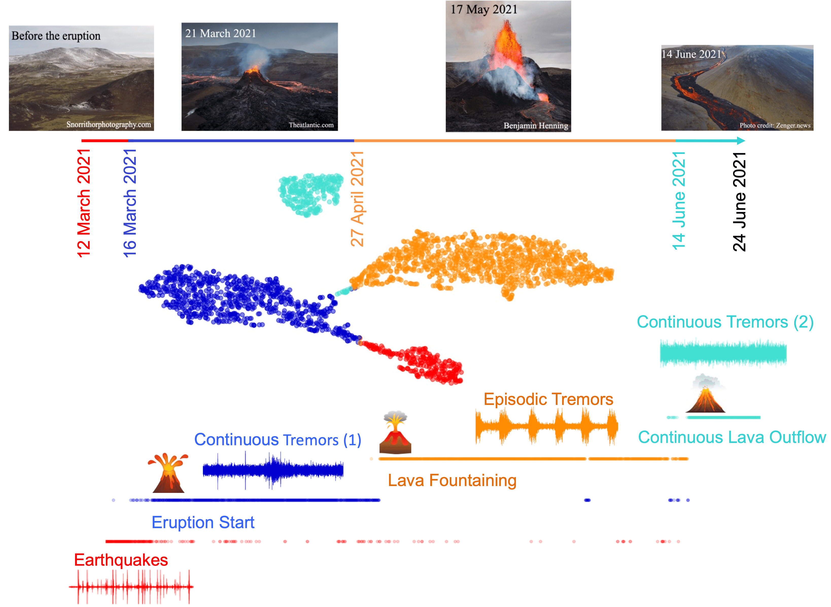 In our quest to analyze seismic data of the 2021 Geldingadalir eruption, we’ve developed a machine learning method. This approach aims to reveal hidden patterns by using a smart neural network to automatically pick out important features from seismic waveforms. Enter Deep Embedded Clustering (DEC), a technique that optimizes feature extraction and clustering simultaneously, bringing out seismic secrets like never before. With this method, we dive into the eruptive system’s key phases by analyzing seismic signals across the eruption cycle. What’s exciting is that we can automatically distinguish unrest activities, ongoing lava extrusion, and various intensities of lava fountaining. It’s like giving the volcano a voice, and we’re finally tuning in.