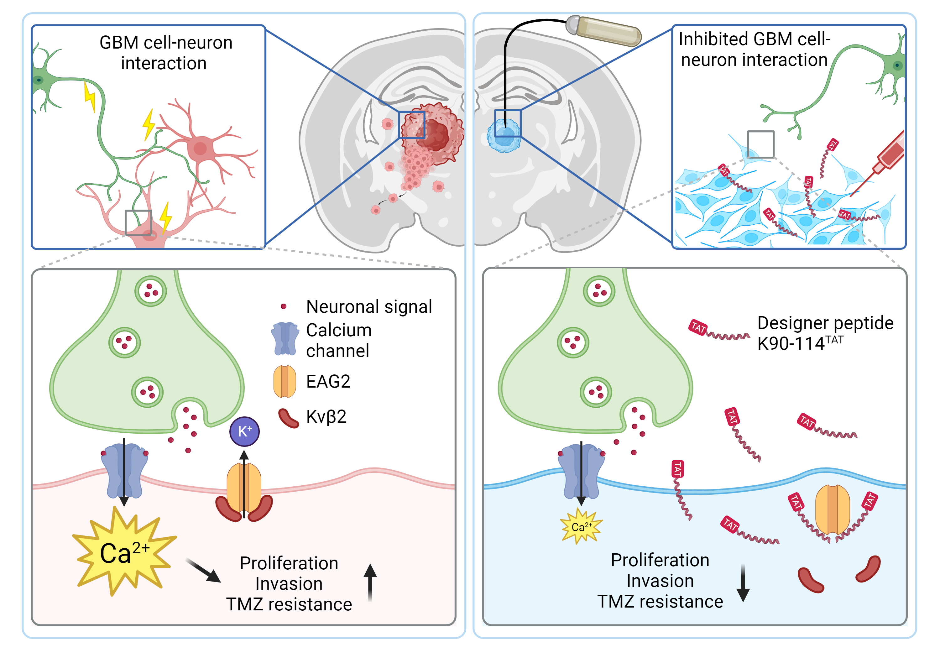 Figure 1. EAG2 and Kvβ2 physically interact to form a potassium channel complex at neuron-GBM contact sites. EAG2-Kvβ2 complex regulates Ca2+ transients of GBM cells and promotes GBM growth, invasion, and chemoresistance. Designer peptide K90-114TAT disrupts EAG2-Kvβ2 complex formation, mitigates GBM aggression, and is efficacious in treating both TMZ-sensitive and -resistant GBM.