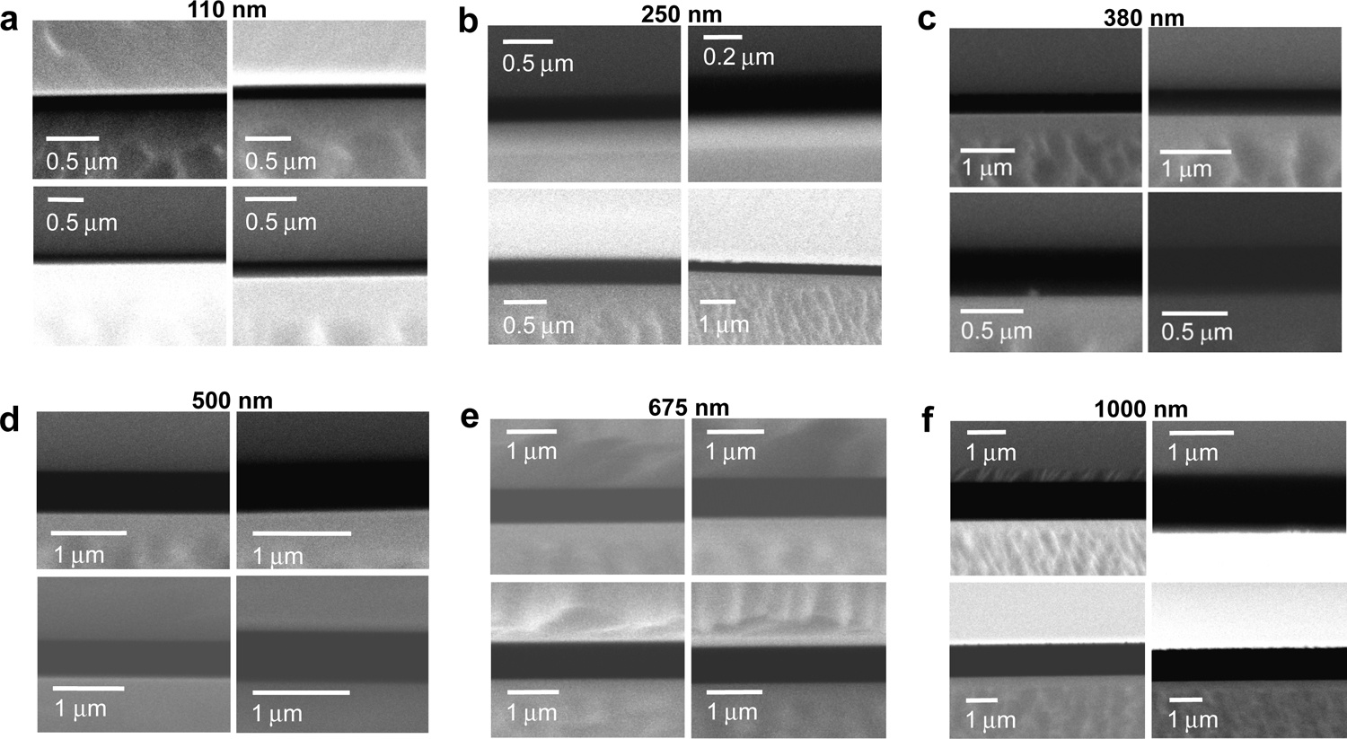 Standalone devices are manufactured by separating the surfaces by pillars. The structural integrity of the device depends on the number of pillars and their diameter; the larger is the contact area between the pillars and the surfaces, the better it is from a robustness standpoint. The pillars however introduce a pathway for heat to flow by conduction, and the conduction rate between the surfaces increases linearly with the contact area. Similarly, sub-500-nm pillars lead to large conduction rate, as conduction is inversely proportional to the pillar length. To minimize conduction while ensuring the device structural integrity, we manufactured pillars with large diameters (20 μm to 30 μm) that are much longer than the gap spacing into micrometre-deep pits etched into one of the surfaces. The device structural integrity enables visualizing the gap spacing via scanning electron microscopy (SEM), as shown in the figure below. We cannot understate the importance of SEM imaging in our work. By visualizing the gap spacing, we were able to directly assess the quality of the device (presence and uniformity of gap spacing). All devices that passed the SEM quality control step resulted in successful heat transfer measurements.