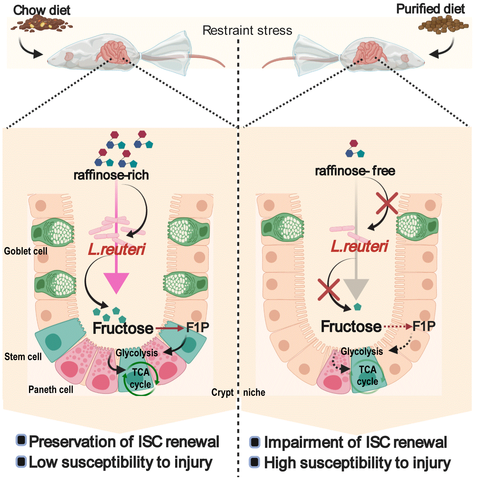 Dietary pattern impacts restraint stress-induced gut microbial remodeling and epithelial renewal. Dietary raffinose metabolism by Lactobacillus reuteri (L. reuteri) to fructose, which is markedly different in mice fed chow or purified diet, couples stress-induced gut microbial remodeling to intestinal stem cells (ISC) renewal and epithelial homeostasis. At the crypt level, raffinose-derived fructose augments and engages glycolysis to fuel ISC proliferation, underlying less susceptibility to psychological disturbance. F1P, fructose-1-phosphate.
