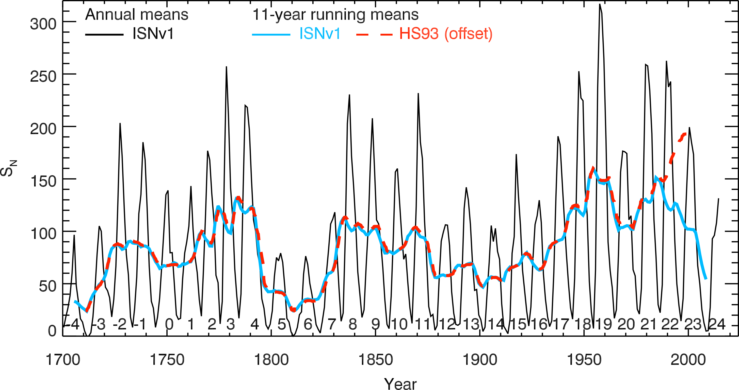 I started by trying to identify the source data and replicate their methodologies in producing each of these 5 indices. This required consulting additional sources from the literature which might contain hints about this model as well as digitizing the indices from the HS93 paper figures to reveal their characteristics. The sunspot number series was the most straightforward to derive, and that was already sufficient to reveal significant flaws in HS93's analysis. Specifically, they incorrectly shifted the 11-year smoothed sunspot number series 11 years into the past, resulting in an artificial spike in solar activity over the recent decades due to estimated future values.