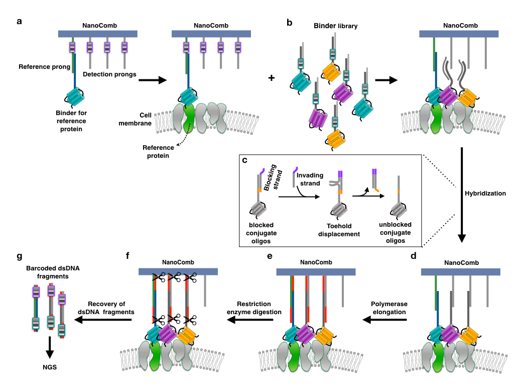 When you hear about DNA nanostructure maybe your mind goes directly to the images of very fancy and original shapes as result of a self-assembling process of specified DNA sequences. But beyond the creativity of researchers, since the development of the first DNA nanostructures by Ned Seeman, many DNA nanotechnology applications have been developed, moved by the fact that, as in most living organisms DNA functions as genetic information carrier, DNA assemblies could be used as a nanoscale tool to acquire and convey information. Inspired by that, we developed a DNA nanoassembly-based approach, termed NanoDeep, to decipher the nanoscale spatial distribution of membrane proteins. We exploited a simple DNA assembly, that we named NanoComb, to translate membrane protein organization information into a DNA sequencing readout, as shown in our article, just published on Nature Nanotechnology.