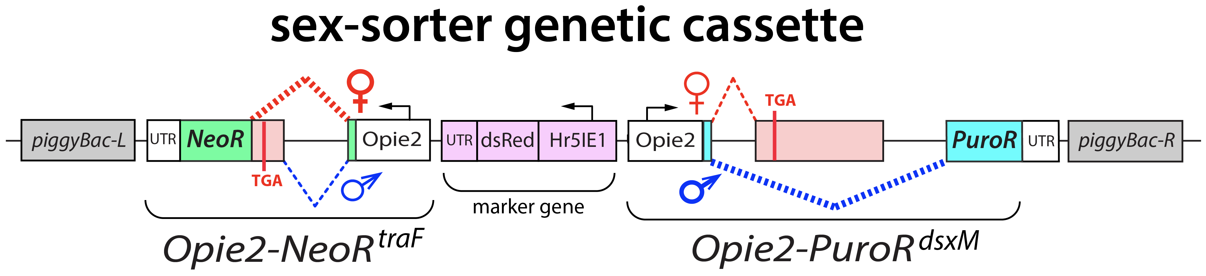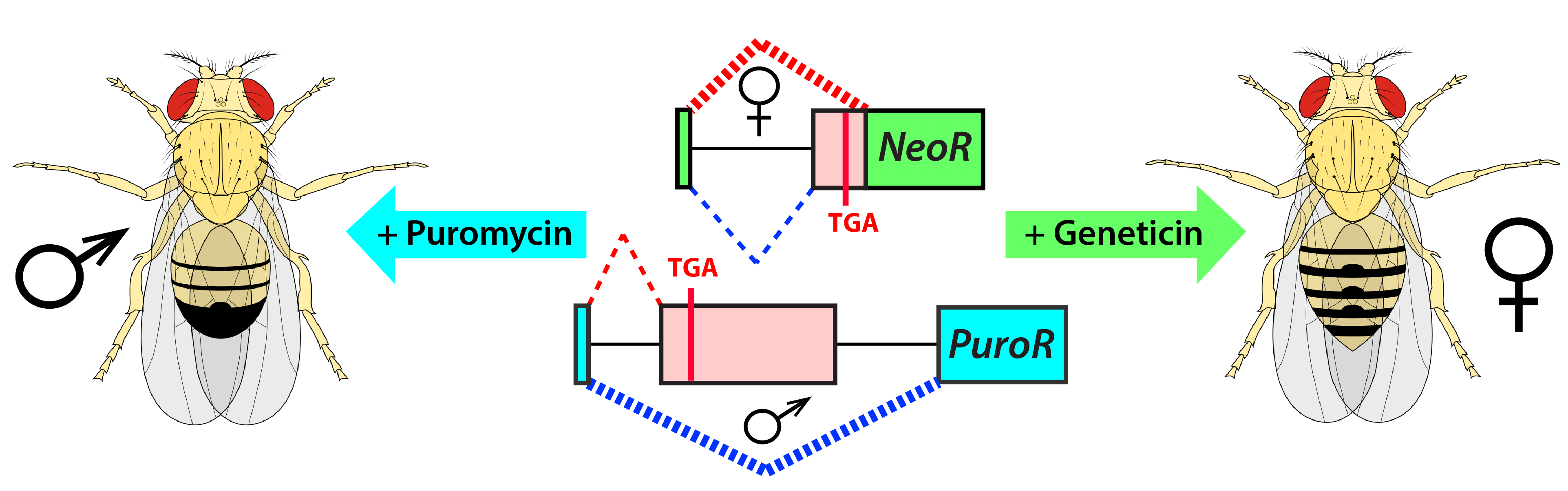 We recently described a positive drug-inducible GSS approach and demonstrated its proof-of-principle in Drosophila melanogaster (4). To establish the positive selection for a specific sex, we engineered the sex-specific expression of two common antibiotic-resistance genes (NeoR and PuroR) by incorporating sex-specific introns (traF and dsxM) disrupting the genes’ coding sequences.