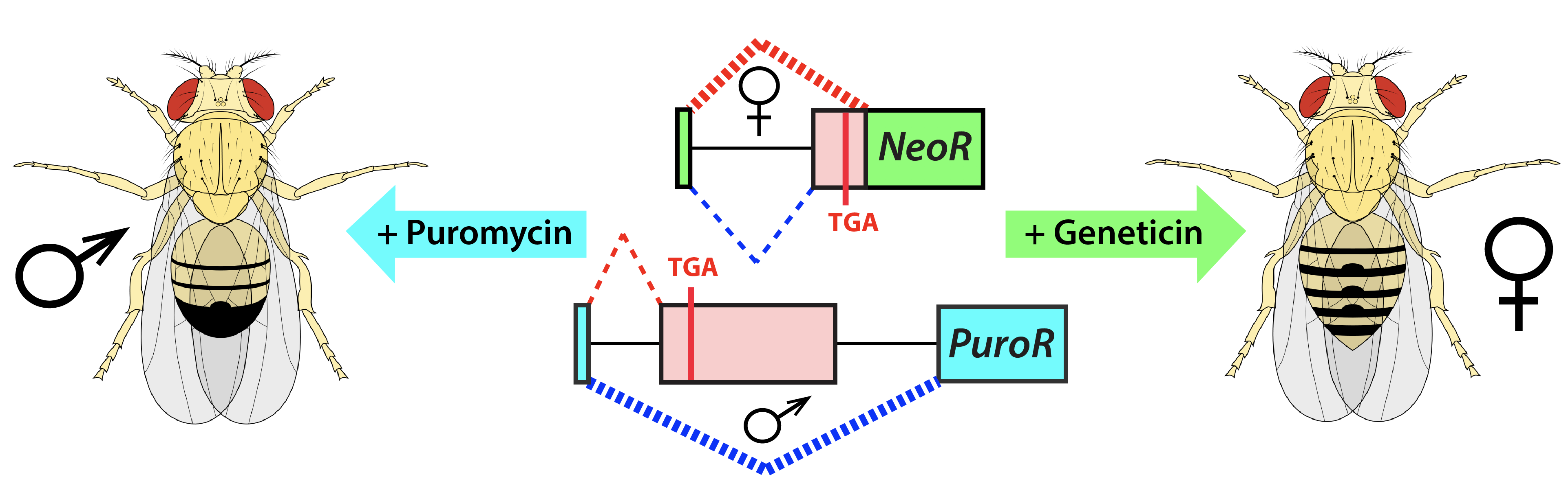 We recently described a positive drug-inducible GSS approach and demonstrated its proof-of-principle in Drosophila melanogaster (4). To establish the positive selection for a specific sex, we engineered the sex-specific expression of two common antibiotic-resistance genes (NeoR and PuroR) by incorporating sex-specific introns (traF and dsxM) disrupting the genes’ coding sequences.