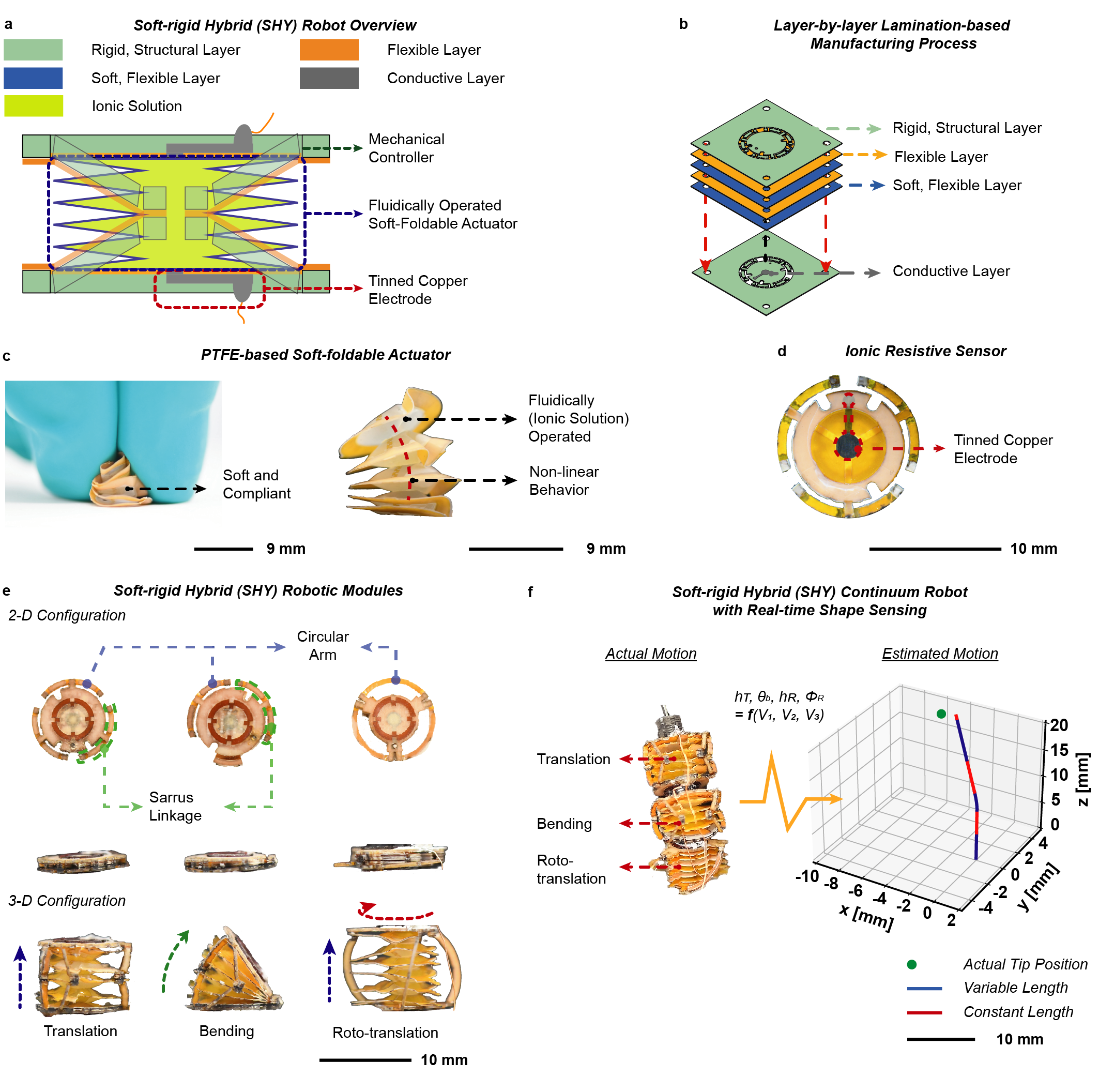 Figure 1. SHY robots overview. (a) A schematic illustration of a SHY robotic module. A SHY robotic module contains a mechanical controller, a PTFE soft-foldable actuator, and tinned copper electrodes to operate in an encoded manner and self-sense its motion. (b) SHY robotic modules are fabricated by laminating films with various properties (i.e., rigid, flexible, soft, and conductive) (c) A PTFE soft-foldable actuator is made of soft and compliant materials and produces motion upon pressurization. (d) Tinned copper films are installed within the robot to embed an ionic resistive sensor. (e) 2-D (flat) and 3-D (expanded) configurations of SHY robotic modules. Three distinct types of mechanisms (translational, bending, and rotation with translational motion) encode the motion of SHY robotic modules. (f) The SHY continuum robot can sense its shape in real-time using the embedded ionic resistive sensors.