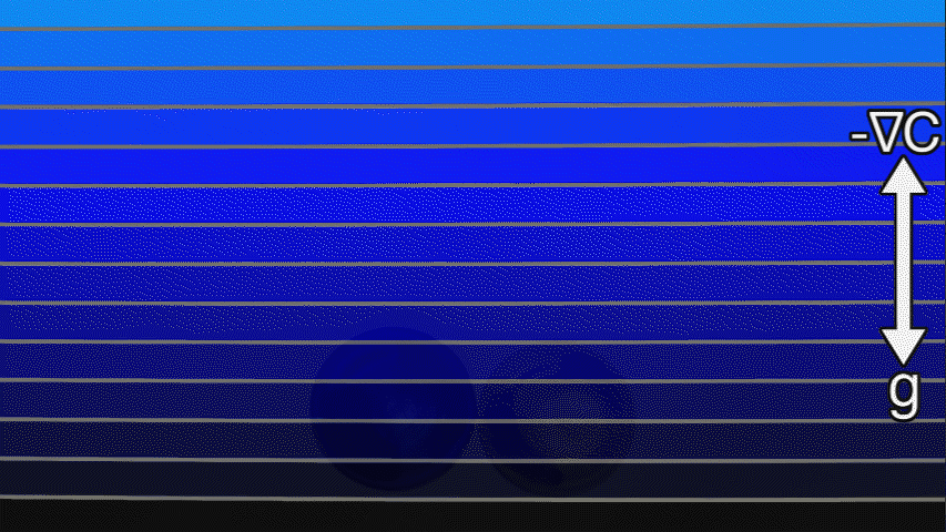 There are a lot of interesting phenomena associated with how matter moves through such an environment. For example, many years ago we established (see ref 1 below) a strange behavior for a sphere falling from the top to the bottom of this setup: spheres which are slightly denser than the bottom fluid, may actually stop falling, and actually start to rise for a short timescale before ultimately falling to the tank bottom. The mechanism involves the fact that buoyant fluid is dragged from the top into the bottom, and also coats the sphere, and this provides the extra buoyancy to hold the sphere for a transient timescale. If the experiment is performed with thousands of very small spheres (50 micron radii), these effects are amplified, leading to the formation of a suspended particle cloud until the enough fluid coating the spheres diffuses away, so that this cloud will start raining particles. We often perform outreach demonstrations of this behavior in our UNC Joint Fluids Laboratory, for visitors to UNC, tours for K-12 students, etc.