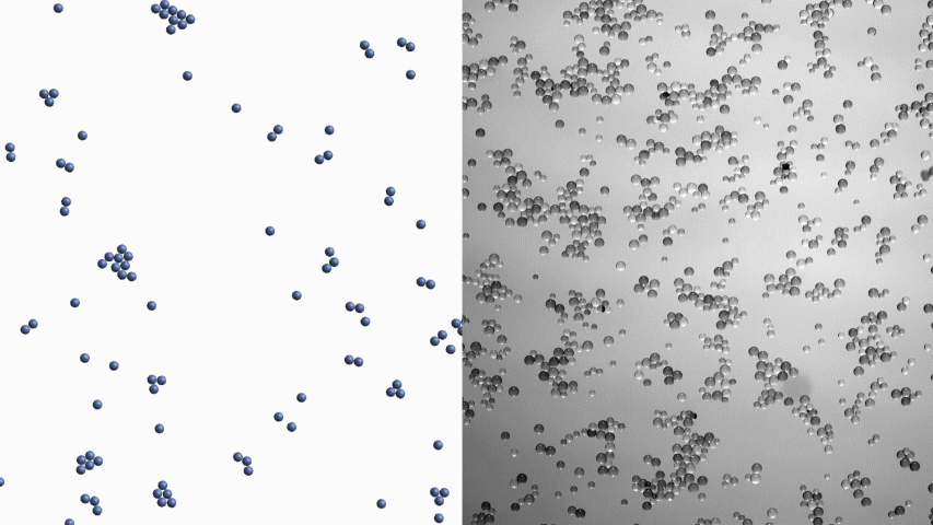 Since these bodies are symmetric, they cannot create propulsion alone, but when a nearby particle at similar height encounters such a flow, it will move with its surrounding fluid and experience an attractive force. If you scale up the phenomenon to thousands of particles, the mechanism amplifies as the aggregate disc size grows. We were able to modify an open access Stokesian dynamics code to include these new pairwise attractive forces to run a full simulation which captures many of the self-assembly experiment's features. The following video shows the simulation compared to the experiment. In particular, physical system’s ability to solve jig-saw like puzzles on its way to forming a large-scale aggregate are captured by our simulations.