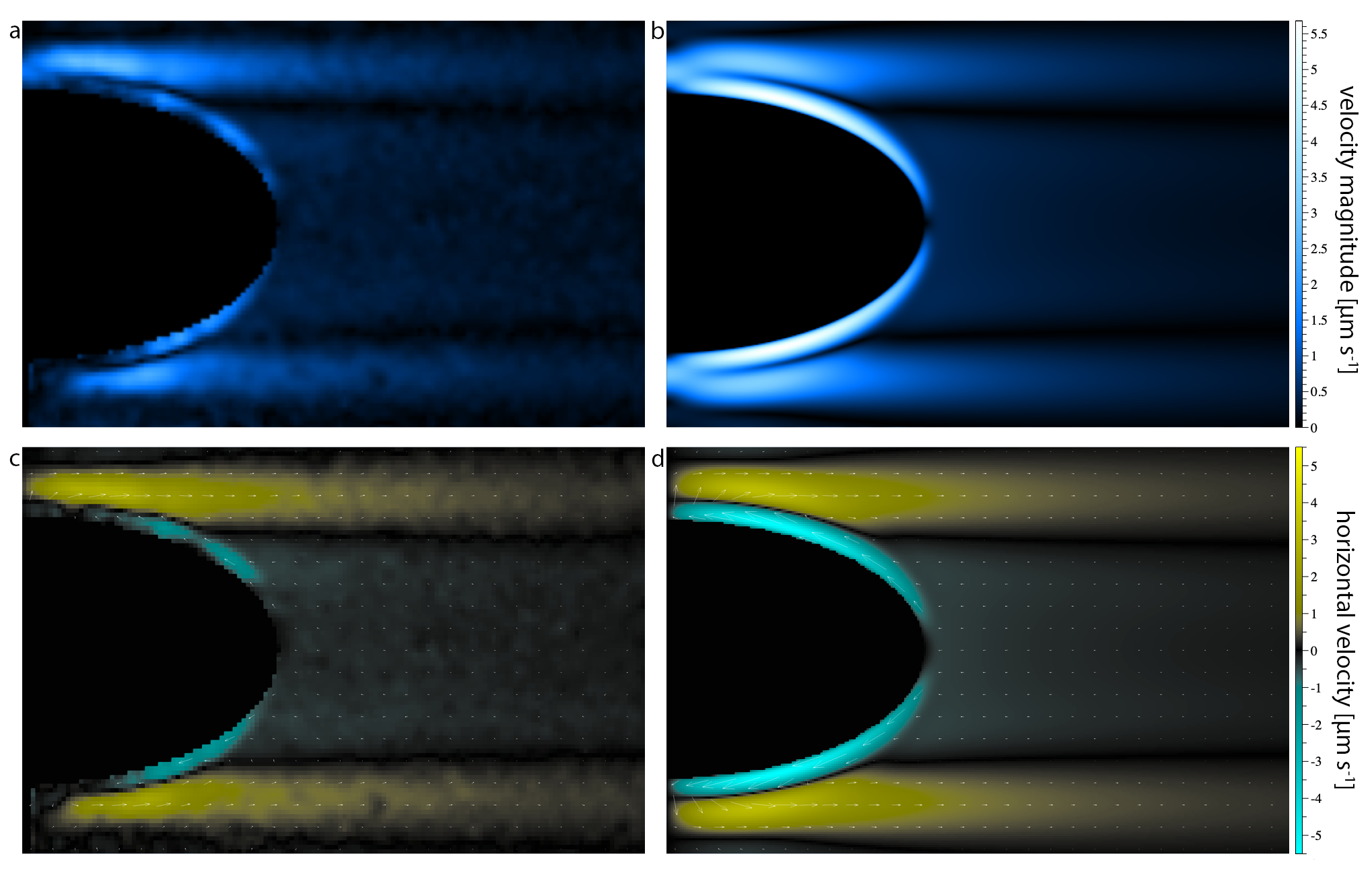 This isoline bending phenomena was first discovered in 1970, independently by Phillips (ref 2 below) and Wunsch (ref 3 below) for a flat tilted plane. For the case of an infinite, tilted plane, they actually wrote down a mathematically exact solution of the governing (Navier-Stokes) equations coupled to an advection diffusion equation for the salt concentration in the presence of a stable, linear background salt concentration. This solution demonstrates a shear flow up the wall, in a narrow boundary layer near the plane. Of course, the behavior even for a single sphere is much more complicated. For the experimental parameters we study, the flow requires numerically simulating the underlying nonlinear partial differential equations. Those simulations for a single sphere reveal a toroidal flow, with converging flow along the equatorial plane and ejection at the poles. Amazingly, these toroidal flow structures are truly realizable in the fluid. Particle Imaging Velocimetry performed on a single oblate spheroid is compared directly to these simulations in a linear background density field in the following figure: