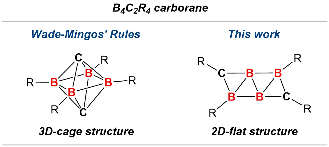 While almost all of the reported carborane clusters are found to be three-dimensional in accordance with the Wade-Mingos’ Rules, it has been computationally predicted that by increasing the number of skeletal electron pairs, two-dimensional carborane molecule would be formed as the most stable configuration. This ‘flattening’ of carborane, however, has never been achieved in a laboratory environment thus far.