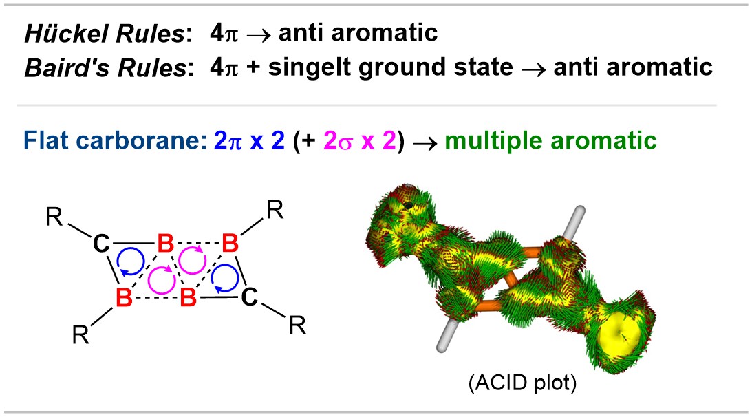More interestingly, a closer look at the bonding and electronic structure within the B4C2 framework, with the help of computational investigations, confirms the aromatic nature of the B4C2R4 carborane. According to the criteria outlined in the (4N + 2) Hückel’s Rule, the B4C2R4 carborane possessing only 4π electrons must be classified as anti-aromatic. Nevertheless, this compound indeed exhibits the aromaticity, which is predominantly owing to the presence of the pronounced ‘local’ aromatic character in the sub-units, rather than the ‘overall’ anti-aromaticity. Thus, splitting the 4π-electron system into two 2π-electron systems may equip the molecule with an aromatic feature.