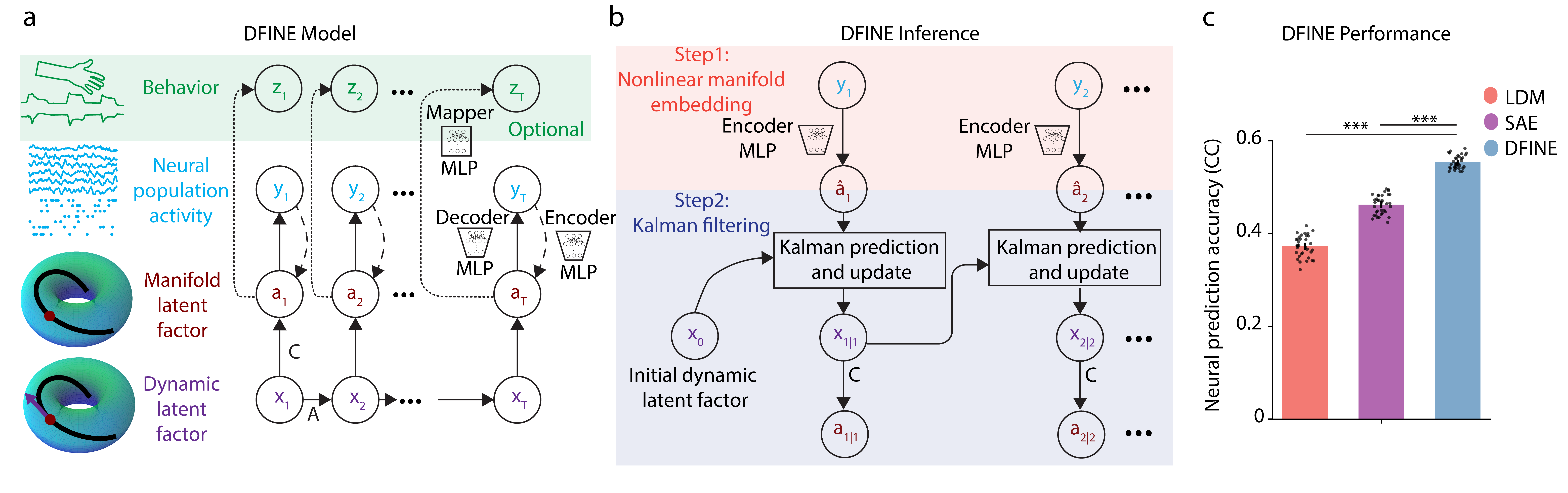 Motivated by this critical need, together with my PhD students Hamidreza Abbaspourazad and Eray Erturk, we developed DFINE (Fig. 1): a deep learning model of brain signals whose inference is both accurate and flexible. Further, DFINE’s inference is recursive and thus computationally efficient for real-time implementation. DFINE consists of dynamic and manifold latent factors (Fig. 1a). The dynamic latent factors describe the evolution of neural activity over a low-dimensional nonlinear manifold in tractable linear form to allow for flexible inference. The manifold latent factors characterize how this nonlinear manifold is embedded in the high-dimensional neural activity space for accuracy. We jointly train the dynamic and manifold factors as well as stochastic noise distributions by optimizing a future-step-ahead neural prediction loss. This loss was important for accurate performance and can be computed during training because of DFINE’s efficient and flexible inference (Fig. 1b).
