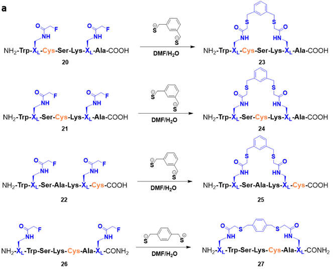 We first set out to evaluate the reaction of the reported fluoroacetamide compound with various nucleophiles such as hydrazine, cysteine, and other thiol containing compounds in mildly basic Tris (tris(hydroxymethyl)aminomethane conditions. Delightfully, the fluoroacetamide compound displayed a strong preference for thiols over other nucleophilic functional groups. At pH 9.0-9.5, benzyl thiol enhanced the conversion of fluoroacetamide much better than cysteine, potentially due to the fluorine-π interaction. Encouraged by this, a model protected fluoroacetamide building block 9 was synthesized consisting of a natural amino acid backbone bearing a fluoroacetamide side chain (Fig.1a). Under FTDR conditions, compound 9 was efficiently converted to compound 17 in good yield. Interested in the chemoselectivity of our FTDR methodology and its efficacy as a macrocyclization strategy we synthesized peptide 18 which possesses multiple unprotected functional groups in addition to α-fluoroacetamide building blocks placed in an i, i+4 stapling fashion (labeled XL highlighted in blue) (Fig.1a). Peptide 18 was subjected to FTDR conditions in the presence of the benzyl thiol cross linker 1,4-benzenedimethanethiol and the conversion to the macrocyclized product 19 was greater than 90% after 12 h (Fig.1b).