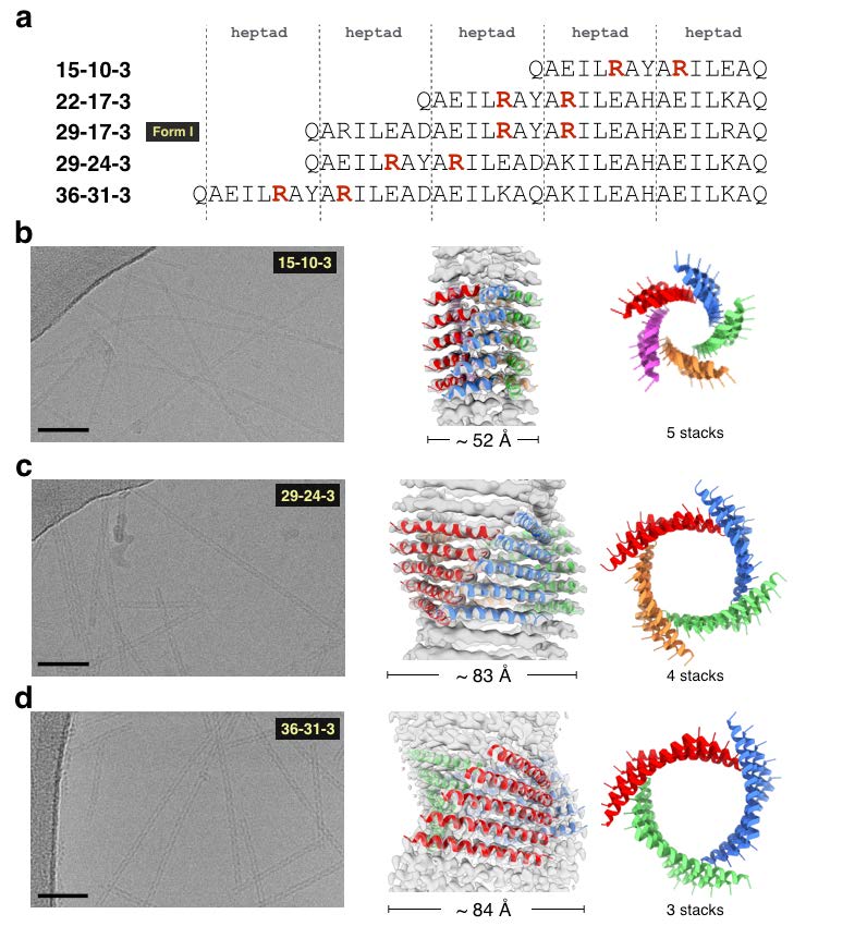 Fig. 1 Cryo-EM of arginine clasp peptide filaments based on Form I. a Sequences of the Form I peptide and four designed peptides derived from Form I. b-d Cryo-EM of peptide 15-10-3, 29-24-3, and 36-31-3. Representative raw micrographs are shown on the left (scale bar 500 Å). The cryo-EM reconstructions are shown in the middle, with models fitted into the maps. The top views of the atomic models are shown on the right.