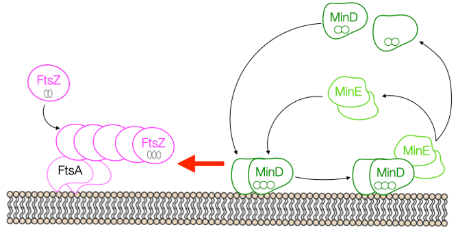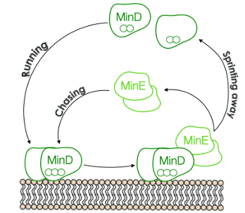 The Min system consists of three proteins MinD, MinE, and MinC, which oscillate back and forth between cell poles, restricting Z-rings formations at midcell4,5. The operating principle is as follows: MinD, upon dimerization, is recruited to the membrane. Once bound, MinD interacts with MinE, causing both proteins to dissociate from the membrane. The sequential interplay between these two proteins is reminiscent of a game of catch. MinE sprints MinD away from the membrane, then MinD runs out to a new location, only to be chased away again. The game between the two proteins results in oscillating gradients throughout the cell, with the highest concentrations of Min proteins at the poles and the lowest in the middle. The remaining player, MinC, tags along to the oscillating game, and its job is to prevent the formation of the Z-ring. The time-averaged concentration of MinC is the lowest at midcell, allowing the contractile ring to develop solely there6,7.