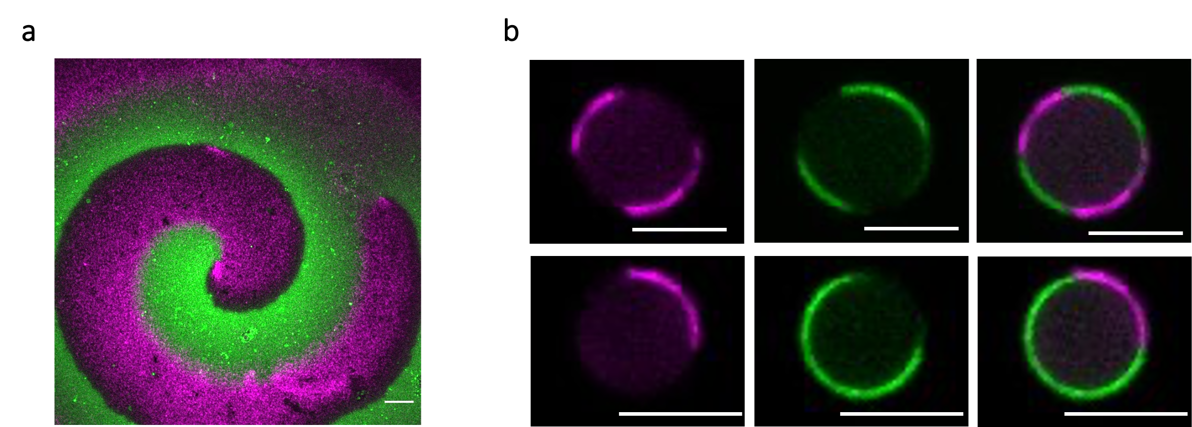Figure 2. Fluorescence microscopy images showing antiphase spiral oscillations of FtsA-FtsZ (magenta) and MinD-MinE (green) on top of a supported lipid bilayer (a) and within two water-in-oil droplets (b). Scale bars are 10 µm.