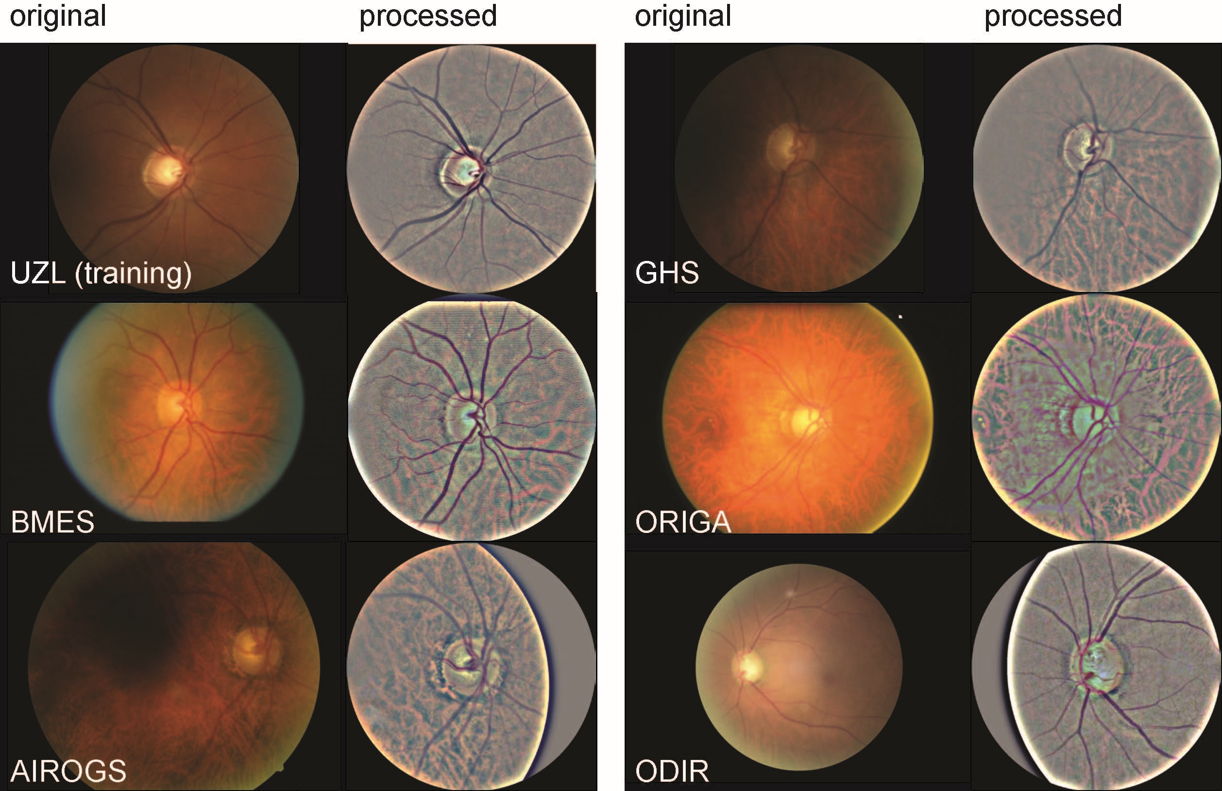 To test the generalizability, or ability to generalize to new data, we bundled thirteen different data sources of labeled fundus images. These sources included two large population cohorts, namely the Australian Blue Mountains Eye Study (BMES) and the German Gutenberg Health Study (GHS), as well as eleven publicly available datasets (AIROGS, ORIGA, REFUGE1, LAG, ODIR, REFUGE2, GAMMA, RIM-ONEr3, RIM-ONE DL, ACRIMA, PAPILA). To ensure consistency in the input data, and to minimize the data shift, we developed a standardized image processing strategy that generated 30° disc-centered images from the original data (see inserted illustration). Our model testing encompassed a total of 149,455 images.