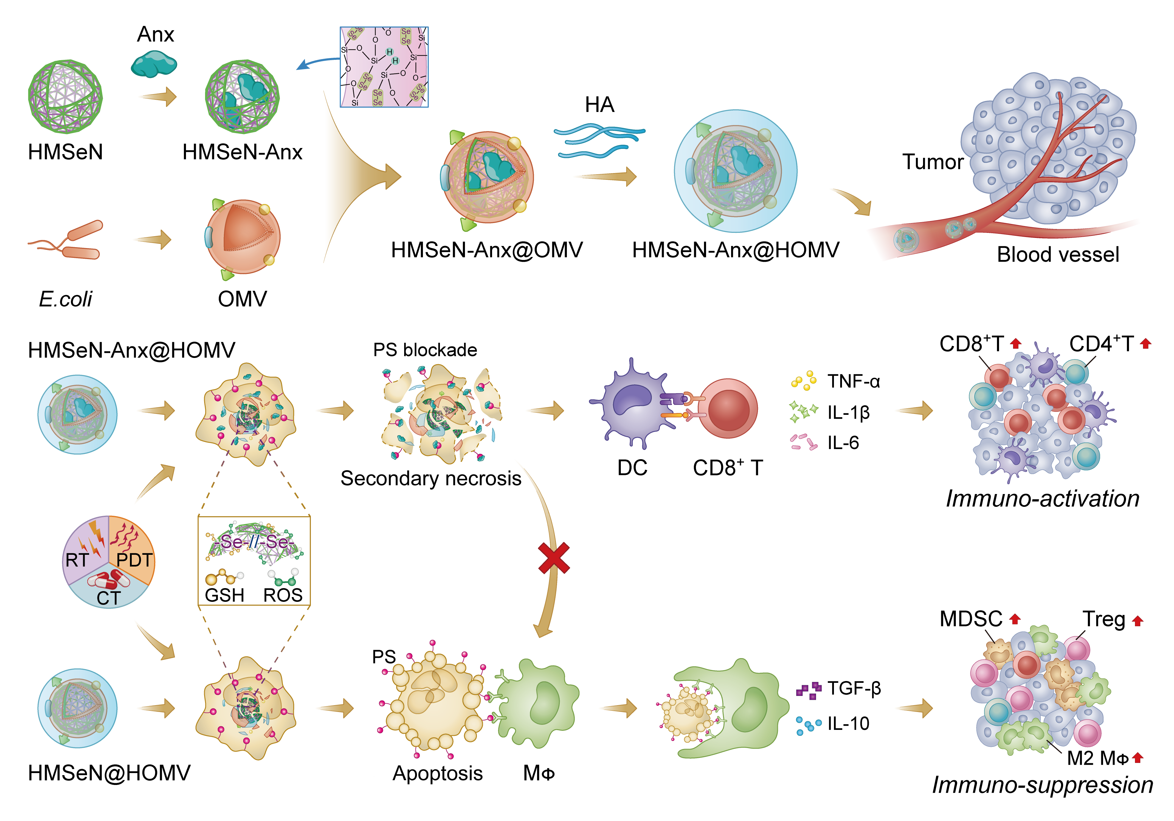 In our most recent study in Nature Biomedical Engineering, we developed a generic approach for preparing autologous tumour therapeutic vaccines through rewiring immunosuppressive apoptosis signalling into immunostimulatory secondary necrosis to provoke personalized anti-tumour immune responses (Figure 1). In the method, a biodegradable diselenide-bridged hollow mesoporous organosilica nanocapsule (HMSeN) was prepared for the delivery of Annexin A5 (Anx) protein, a commonly used molecular imaging agent for apoptosis detection.3 The resulting nanocapsule achieved “on-demand” burst release of Anx due to oxidation/reduction-responsive diselenide bond cleavage4 in oxidative tumour microenvironment or bioreductive intracellular environment. In this way, the released Anx blocked phosphatidylserine (PS) exposure on dying tumour cells, prevented the recognition and the subsequent phagocytosis of macrophages. These dying tumour cells would further undergo secondary necrosis, which simultaneously rendered the tumour immunogenic and inflamed the tumour microenvironment.