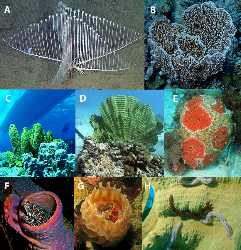 Though one might mistake them for corals, it’s hard to look around a coral reef and not find an abundance of sponges. In fact, sponges can occupy up to 50% of the reef surface area and, like corals, they make good homes for a wide array of reef organisms (see examples below). More importantly, sponges are critical for the health of coral reefs because they are central to the so-called “Sponge Loop1.” The crux of the sponge loop is this: Although coral reefs are some of the most productive ecosystems on earth, they are often referred to as “marine deserts” because nutrient concentrations in the water column are quite low. Nutrient retention, then, is critical. Sponges filter out large quantities of organic matter (e.g. sugars and proteins) that were released into the water column by organisms living on the reef and convert it into sponge tissue. The sponge cells are then released into the seawater at a high enough rate that the net biomass gain to the sponge is approximately zero. The released sponge cells are then eaten by detritovores, which are then eaten by other organisms that will later release organic matter into the water column, thus completing the loop and keeping nutrients locked within the reef. Although to the human eye sponges appear to be inactive, they are very important components of tropical coral reefs. See here for a demonstration of sponge feeding.