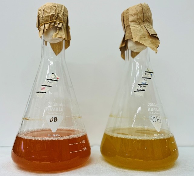 Cyanophage lysate preparations. Cyanobacteria infected by WT (right) and mutant (left) cyanophages. Credit: Dr. Shirley Larom