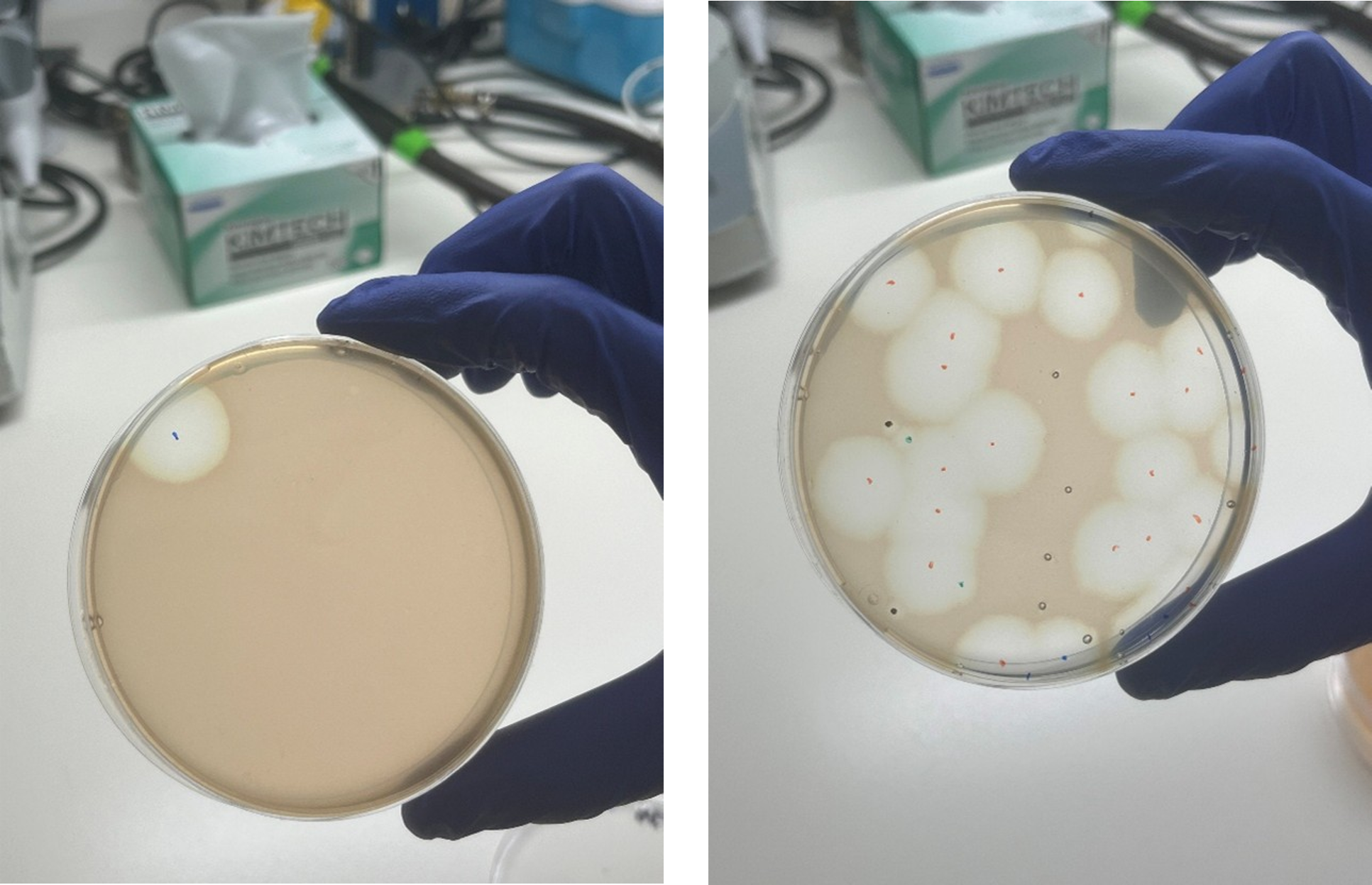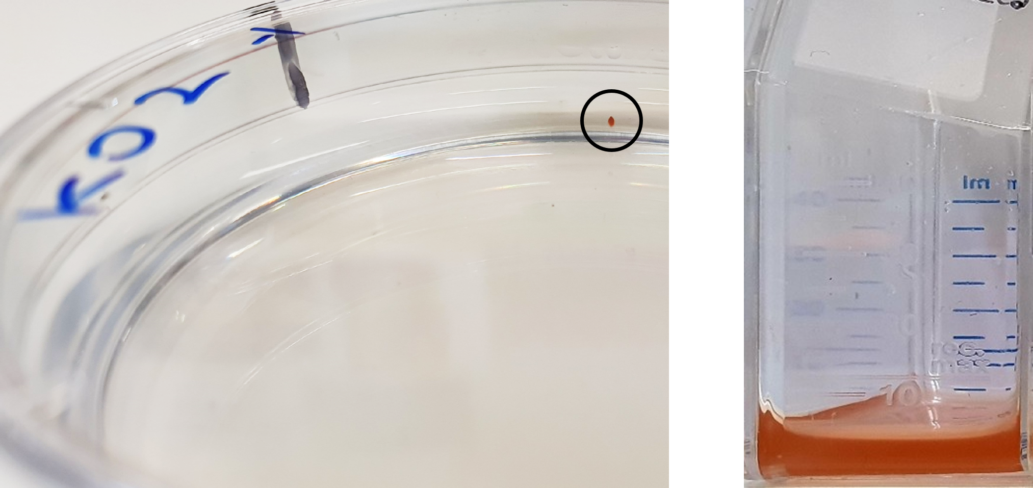 Conjugant colony (marked with a black circle) carrying a plasmid with deleted viral nblA, before (left) and after (right) transfer to liquid medium. Credit: Dr. Shirley Larom