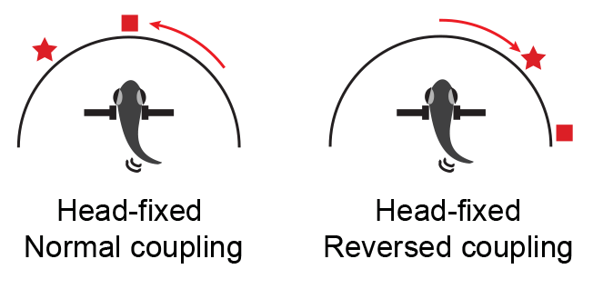 Fig. 2 – As the Head-fixed Normal coupling fish turns to the right, the VR environment it sees between the star and the square moves the opposite way, in the direction of the arrow, as it would in reality. In the reversed coupling experiment, as the fish swims right, the VR environment it sees between the star and the square moves in the same direction as the fish, the opposite of what would happen in reality.