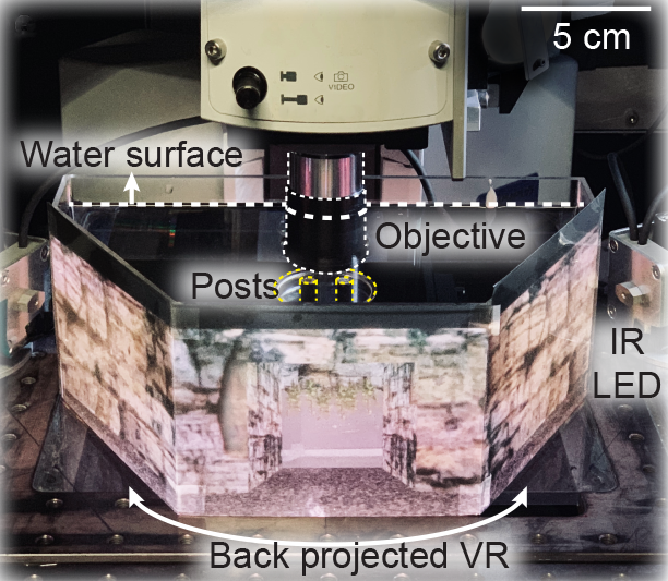 In a paper that has been published this month in Nature Methods, we now present a virtual reality (VR) experimental set up that can resolve this conundrum. In this setup, adult zebrafish are fixed in place by a head bar under a multiphoton calcium imaging microscope. An infrared camera recording the fish’s swimming action provides feedback to the virtual environment, so that it can be updated in response to the fish’s movements. The fish thus gets the impression that it is moving as expected through this virtual environment. This experimental setup allows us to measure neuronal activity during behavior.
