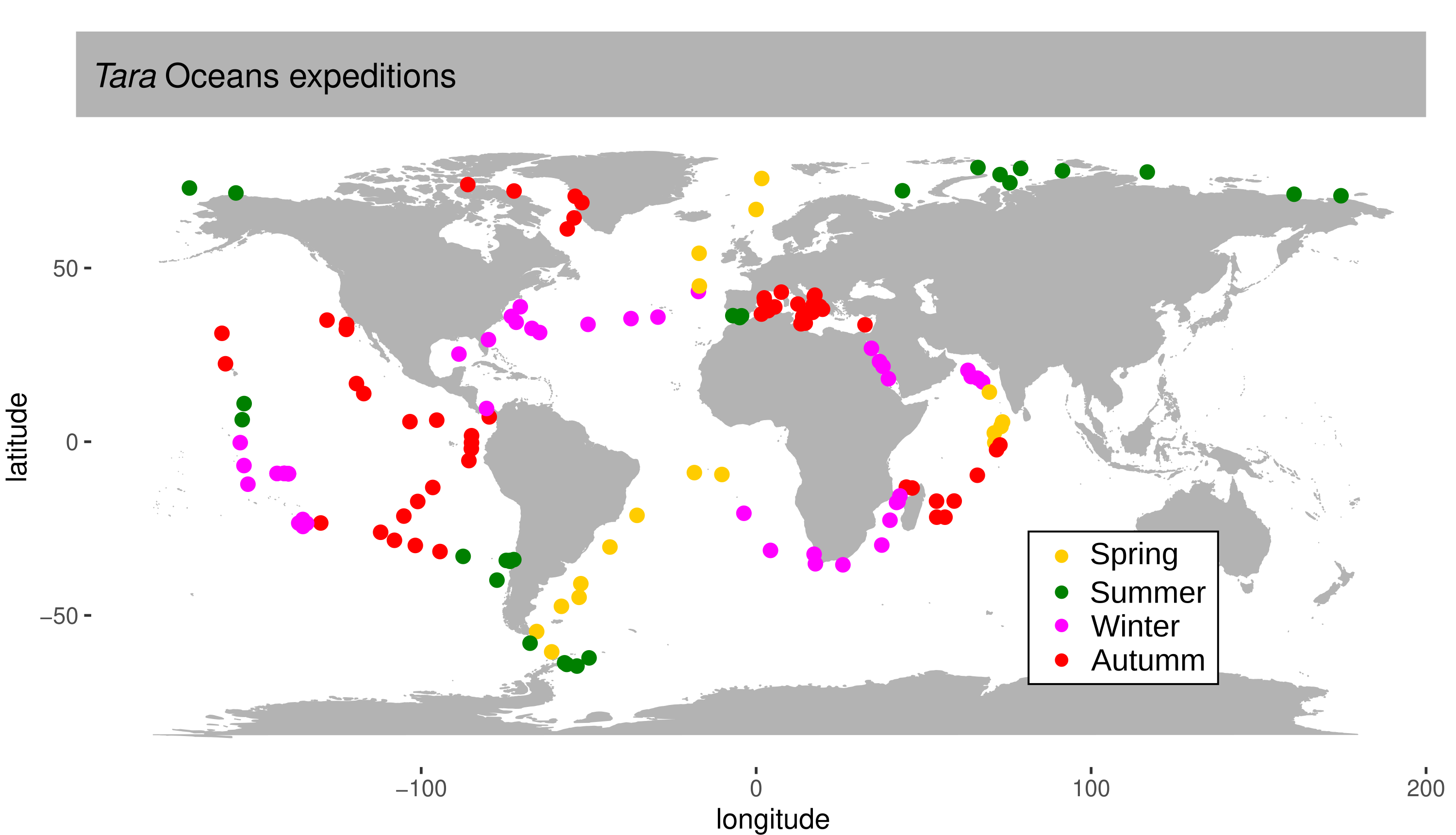 The biogeography of nitrogen-fixers is largely based on short and seasonal expeditions in specific regions of the ocean, but still vast areas remained undersampled. In addition, our view is often based mainly on molecular surveys and is limited to two traditional plankton size ranges (>10 and >0.2 μm). To study microbial populations at a global ocean scale, the datasets generated by Tara Oceans are a remarkable resource. From its departure in September 2009 to its return in December 2013, SV Tara sailed 140,000 km over a period of 38 months across the main oceanic regions (Figure 1), systematically collecting environmental data along with plankton samples covering the whole plankton size spectrum (<0.2 µ to <2 mm). Some of these samples were used to generate parallel molecular (e.g. DNA sequencing) and imaging datasets.