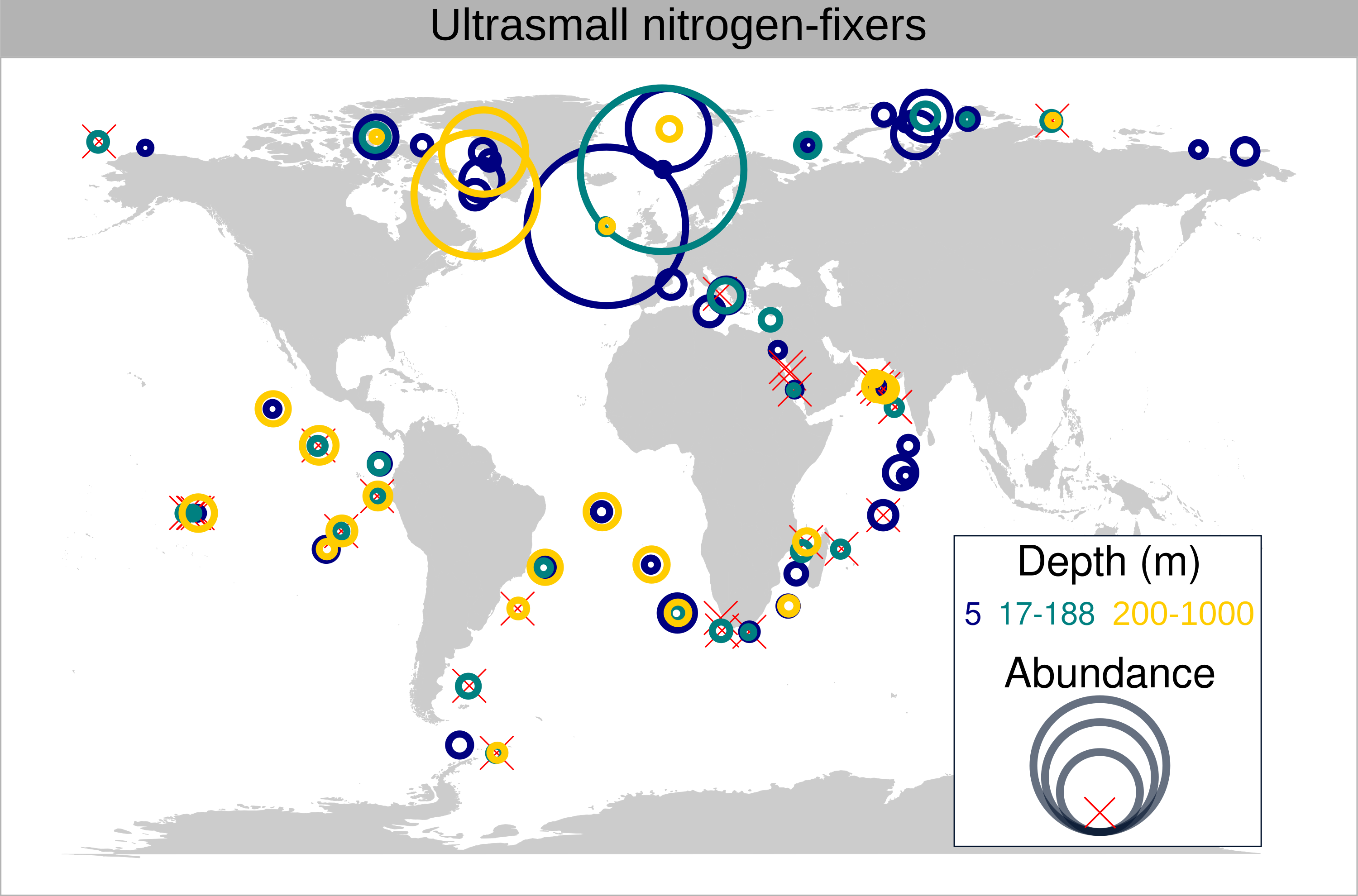 The standard method of collecting free-living single-cell bacteria from environmental water samples is by retaining them on a 0.2-μm-pore-sized filter. In fact, this filter is applied in standard sterilization procedures, such as commercial applications to remove bacteria from heat-sensitive solutions and from drinking-water. However, this filter does not retain “ultrasmall” bacteria, which started to be recognized just very recently. Thus, we investigated the Tara Oceans metagenomes generated from DNA isolated from seawater passing through these filters. There are no reports of “ultrasmall” nitrogen-fixers, thus it was surprising to find sequences for them and to observe their high abundance in the Arctic Ocean, where the other nitrogen-fixers were very rare, and from samples collected from 5 to 400 m of depth (Figure 3). These results prompt the inclusion of ultrasmall plankton in field surveys to quantify their potential ecological and biogeochemical importance.