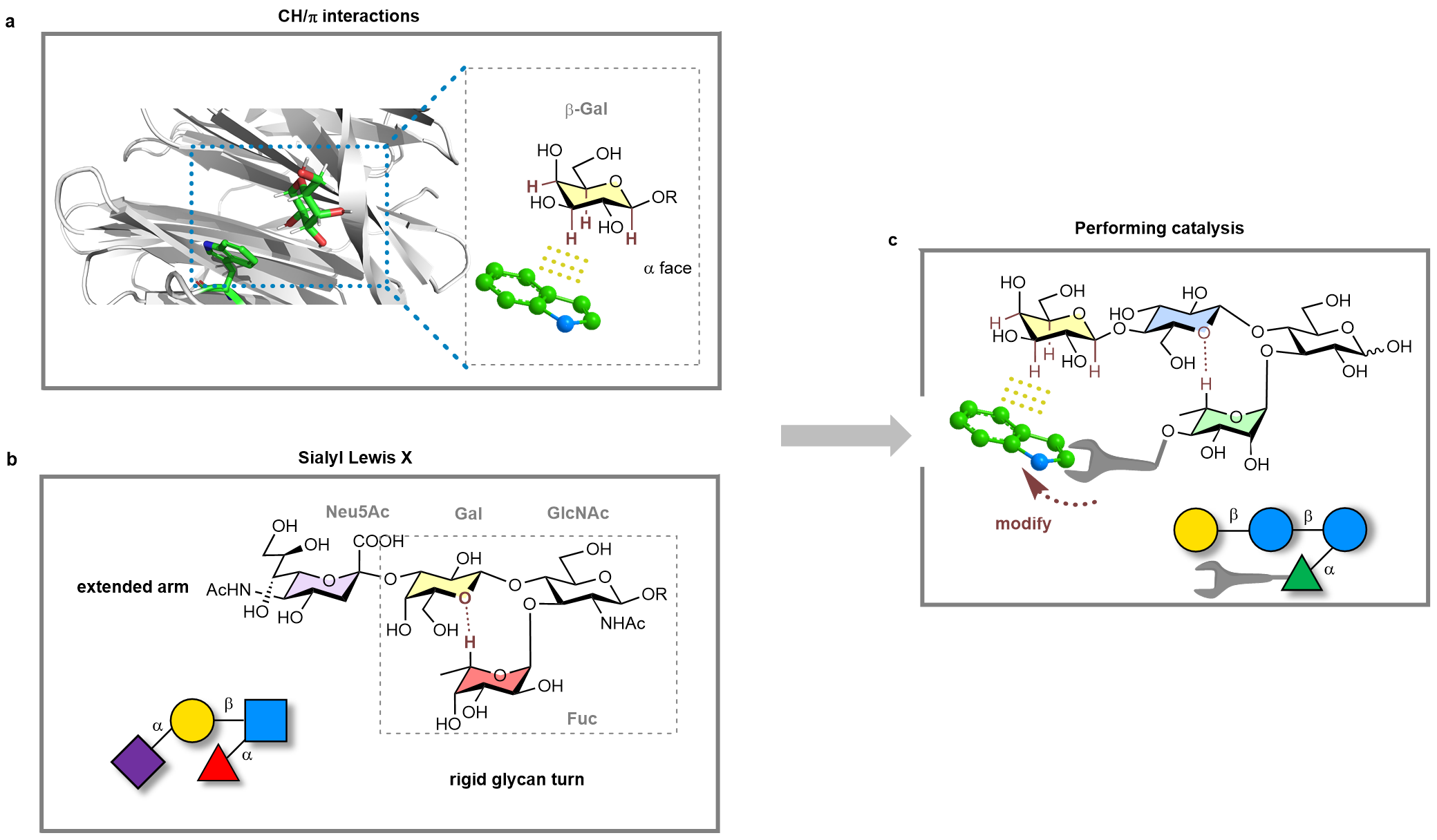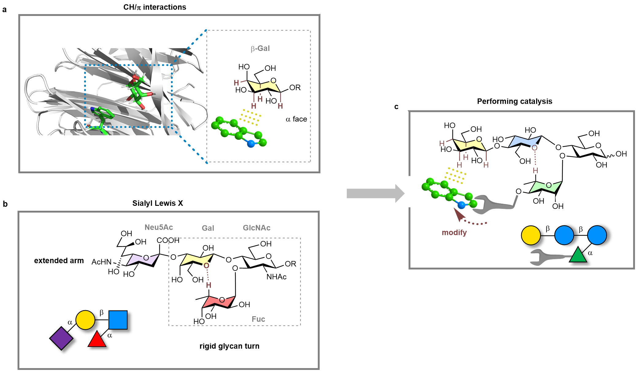 We first turned to nature for inspiration. Many biological systems use glycans to interact with substrates, particularly biomolecules-containing aromatic groups, through a type of weak bonding known as CH/π interactions (Fig. 1a). These interactions are foundational to carbohydrate-binding proteins such as lectins, glycosyltransferases, and enzymes, which selectively recognize and bind sugar structures. The challenge was to identify and then engineer the right glycan scaffold—one that could support CH/π interactions and recruit an aromatic substrate in proximity of the reactive site while maintaining a stable 3-D conformation.