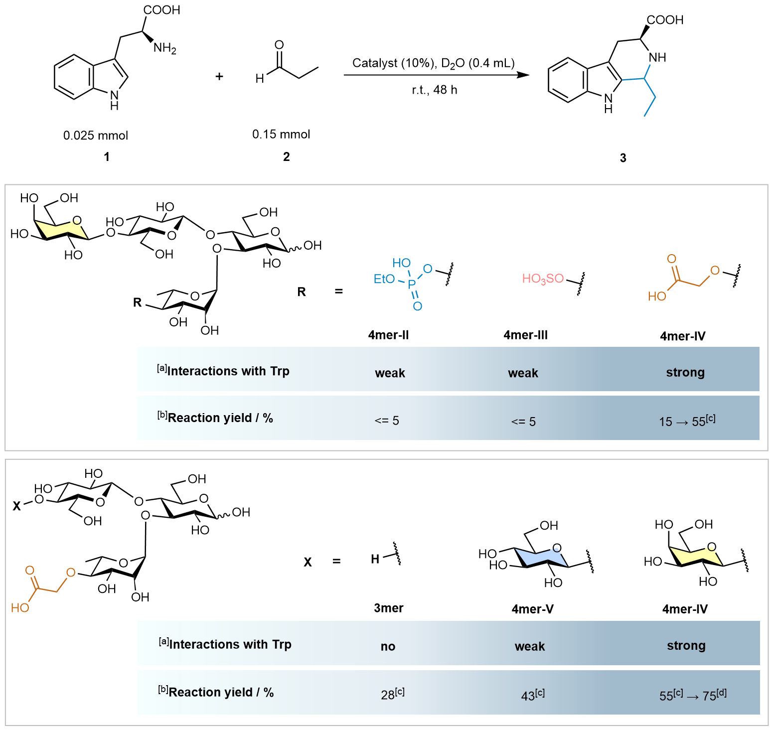 To validate our findings, we synthesized two additional control molecules. The first was a shorter glycan, 3mer, which lacked the CH/π binding site. As expected, it showed no interaction with Trp and resulted in a low reaction yield. The second control was 4mer-V, a glycan with glucose instead of galactose at the binding site. This variant exhibited moderate CH/π interactions and an intermediate reaction yield (Fig. 3). The conclusive proof came when 4mer-IV demonstrated both the strongest CH/π interactions and the highest reaction yield, confirming that these interactions were directly linked to catalytic efficiency.