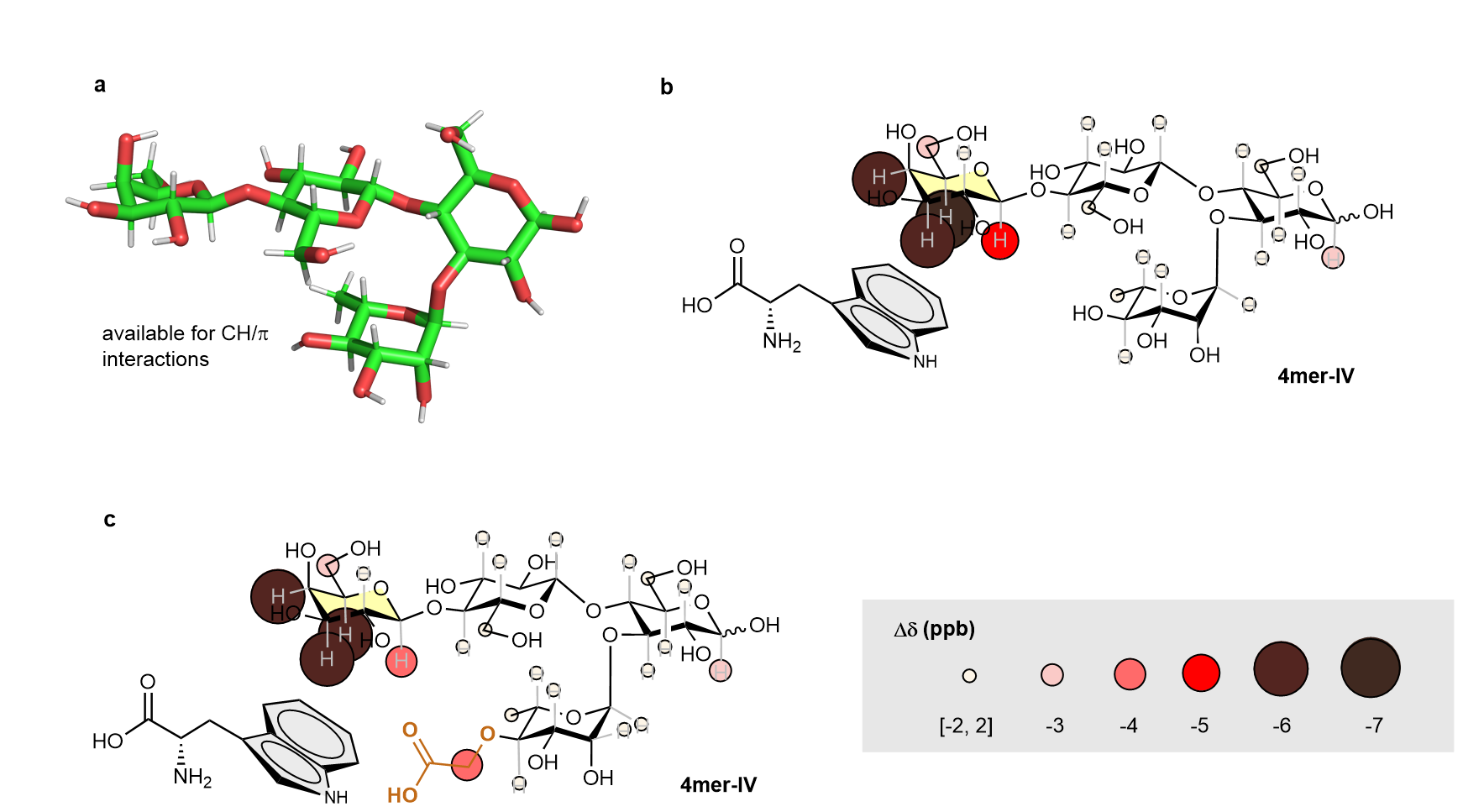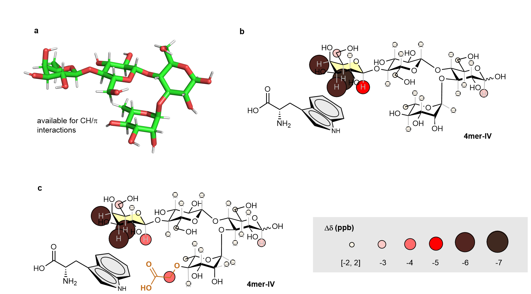 To test whether it could interact with Trp, we synthesized a neutral glycan structure, 4mer-I, and analyzed its folding behavior. NMR spectroscopy and molecular dynamics simulations confirmed that 4mer-I retained its rigid conformation in water—a crucial feature for supporting catalytic function (Fig. 2a). More importantly, when we incubated 4mer-I with Trp, we observed chemical shift changes concentrated around the β-Gal unit, confirming that our glycan successfully engaged in CH/π interactions (Fig. 2b). This was the validation we had been hoping for: our planned interaction site could selectively bind an aromatic substrate in the presence of other sugar units.