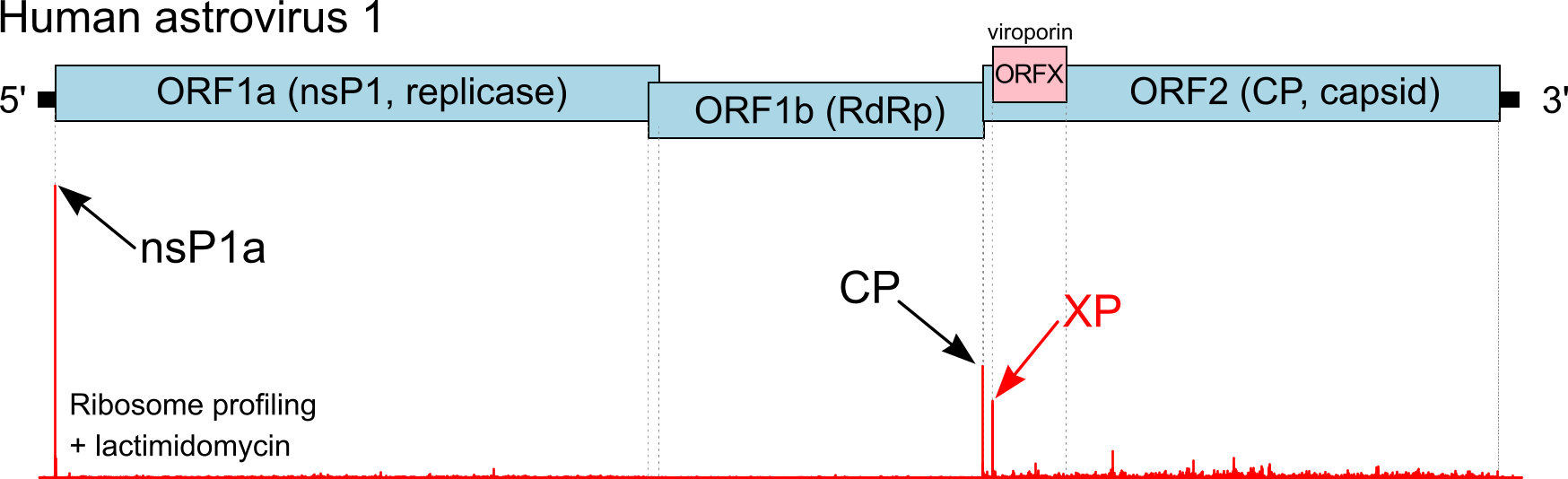 Figure 1. Map of the human astrovirus genome showing the three main ORFs (blue) and the overlapping ORFX (pink) encoding XP (a viroporin). Below is the density distribution of ribosome protected fragments from ribosome profiling of astrovirus-infected cells following treatment with lactimidomycin which stalls ribosomes at initiation sites. Arrows indicate initiation peaks detected for the nsP1, CP and XP ORFs.
