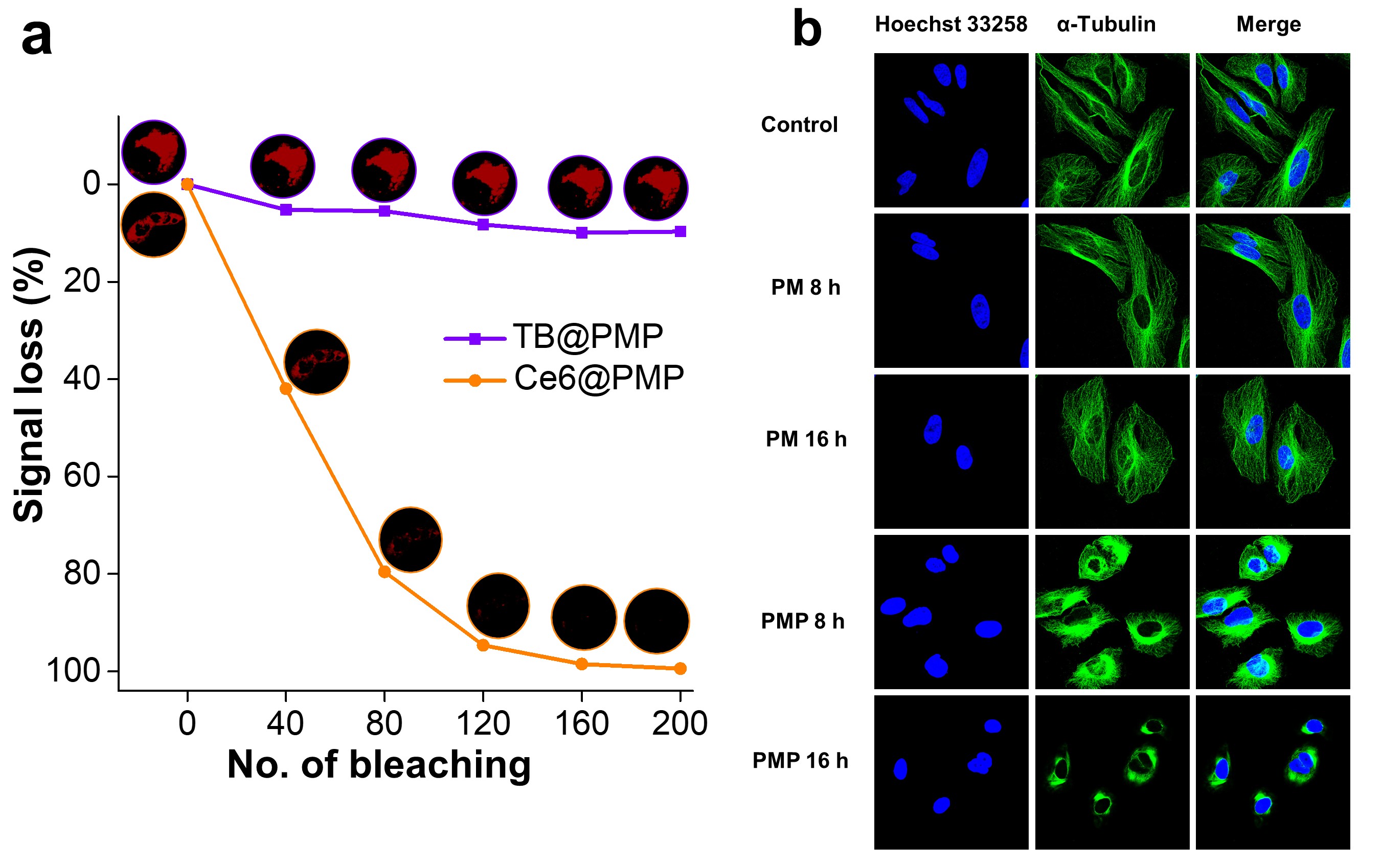 Compared to traditional photosensitizer loaded micelles Ce6@PMP, the TB@PMP micelles had satisfactory photostability and in favor of image-guided PDT (Figure 1a). After TB@PMP micelles were uptake by the tumor cells, the released PTX binds to a specific site of tubulin to prevent its depolymerization, which eventually leads to cancer cell apoptosis (Figure 1b).