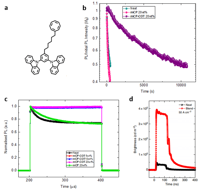 Figure 1. a. Chemical structure of mCP-COT, b. Photostability of BSBCz-EH in neat and blend films; c. Transient PL of neat BSBCz-EH dye and blend films; d. Compared brightness of neat and blend BSBCz-EH OLEDs. BSBCz-EH is the laser dye used in this study.