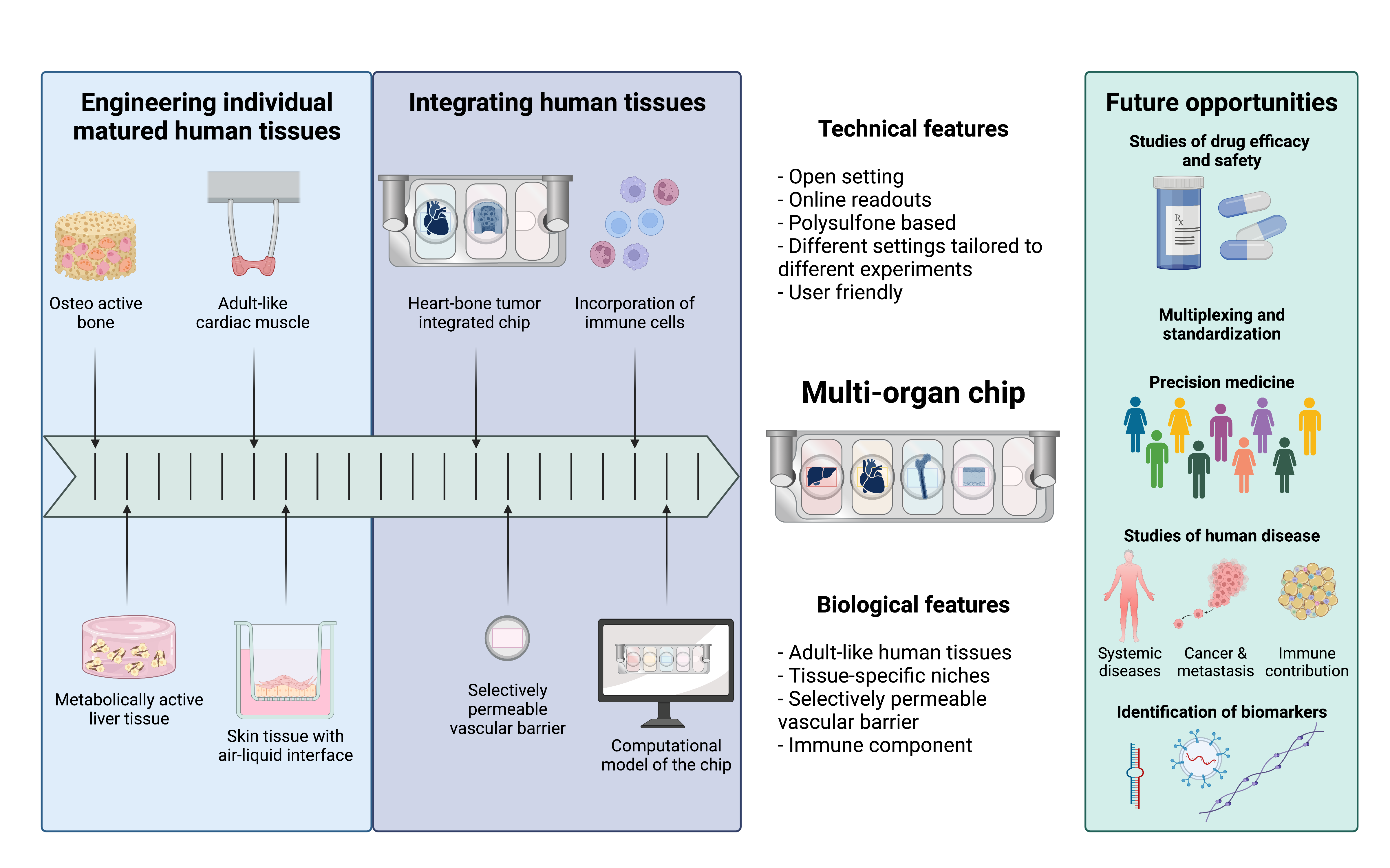 Fig. 2. From engineering individual matured human tissues to an integrated multi-organ chip for precision medicine and pharmacological studies. Created with BioRender.com.